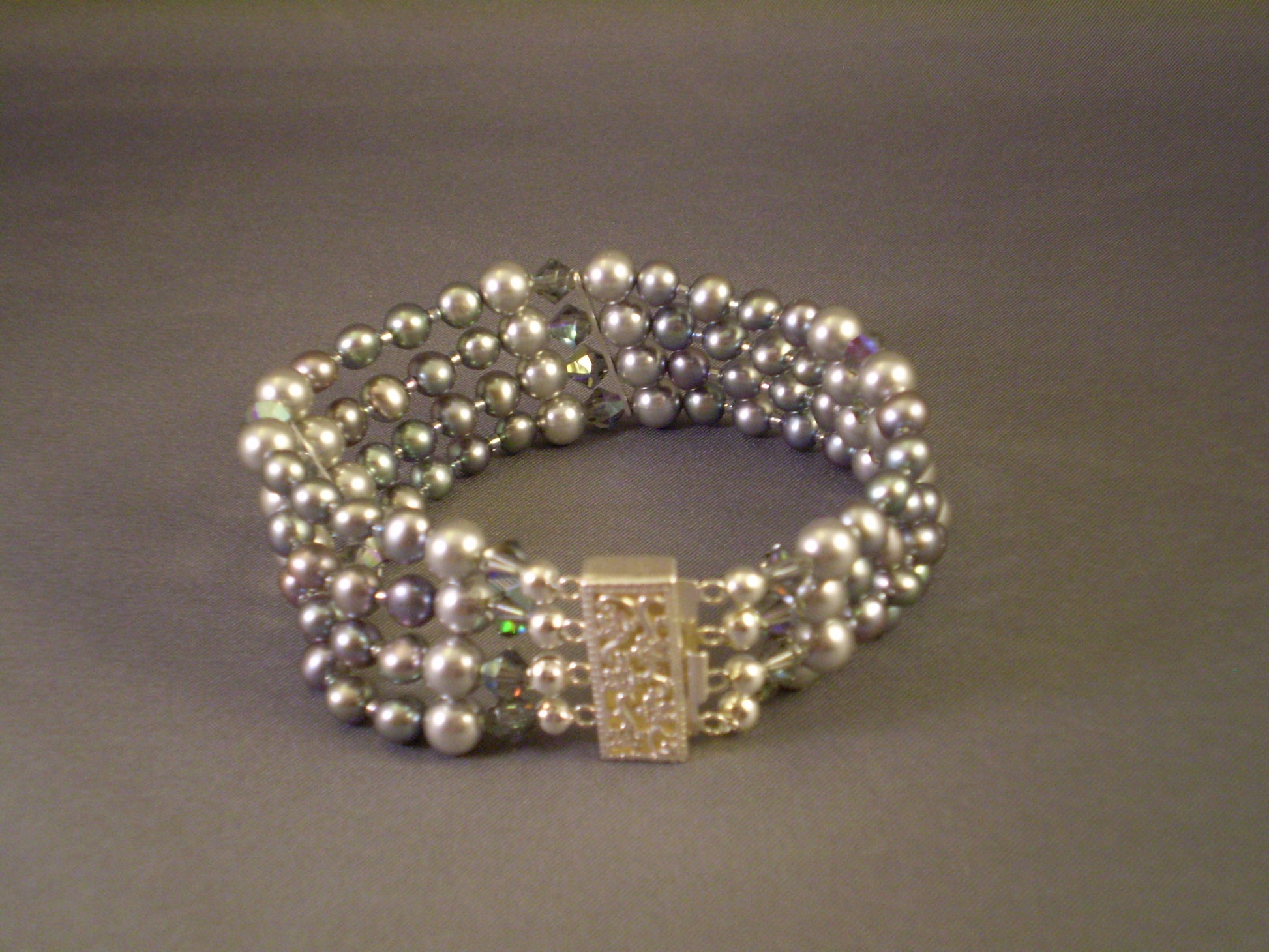 Freshwater pearls and Swarovski crystals with filagree Sterling box clasp and Sterling dividers (7 3/4")