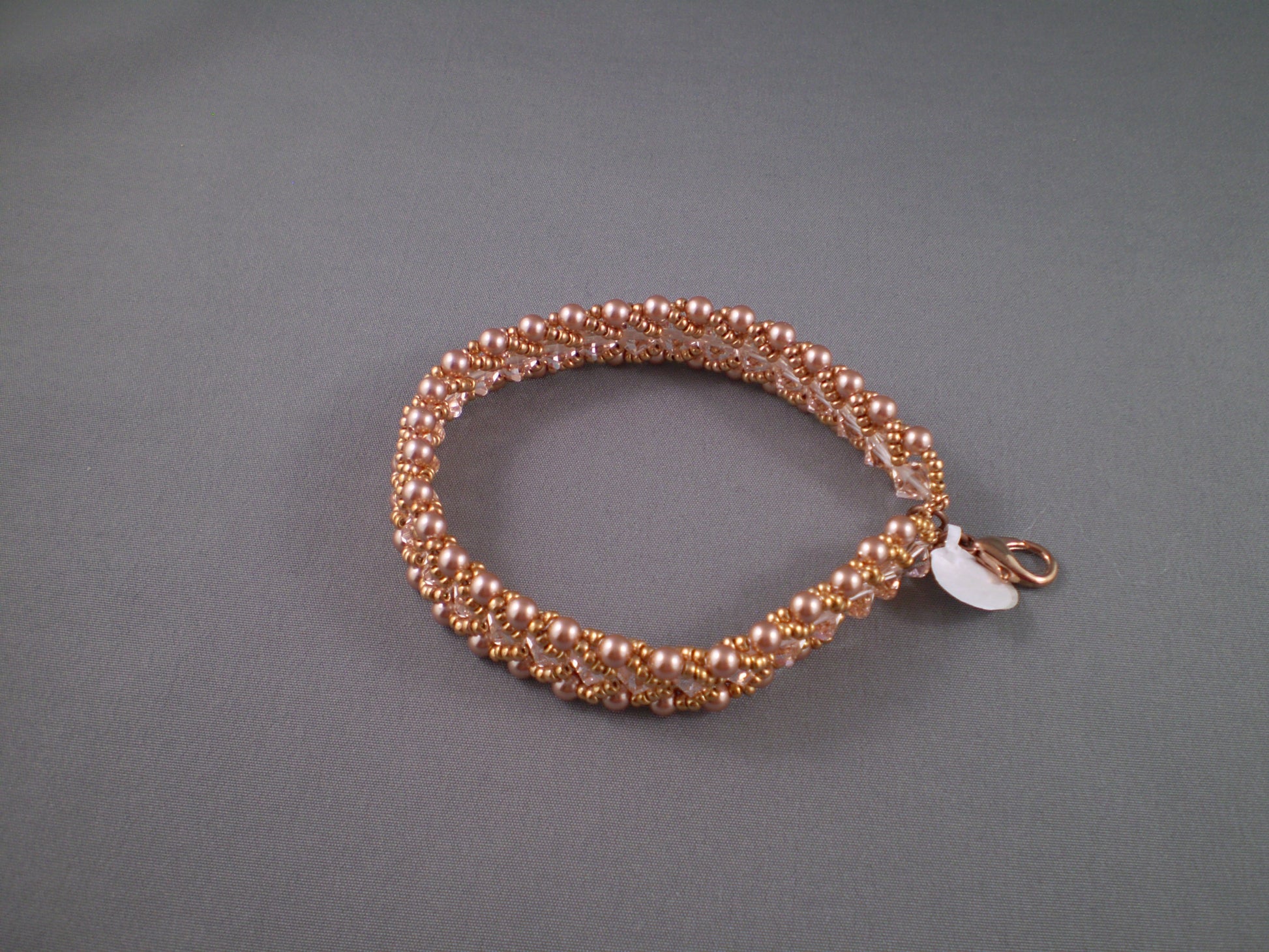 Swarovski pearls and crystals with Japanese seed bead trim and rose-gold-plated lobster closure (8 1/2")