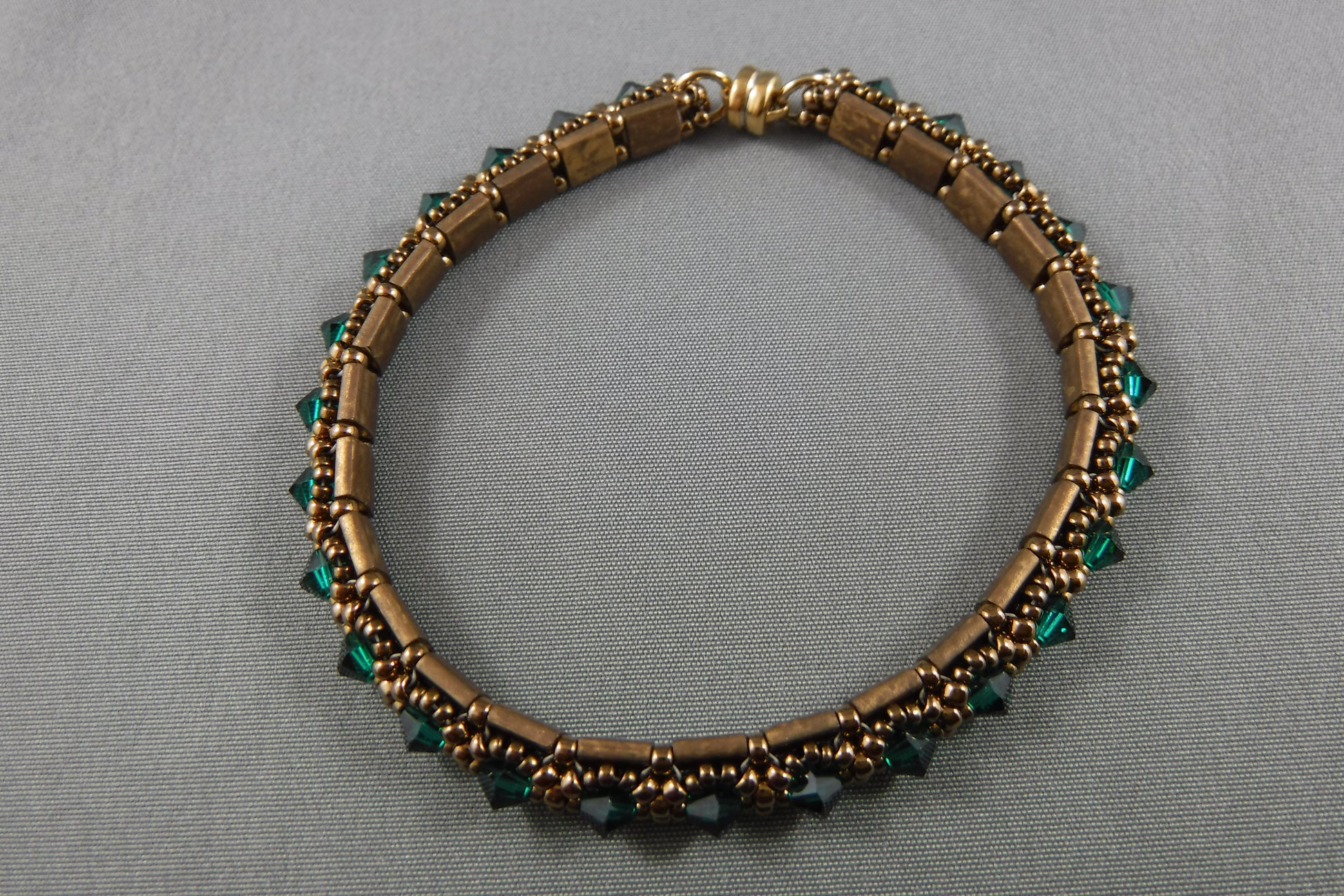 Beaded bangle bracelet with bronze beads and emerald Swarovski crystals: magnet closure (7").