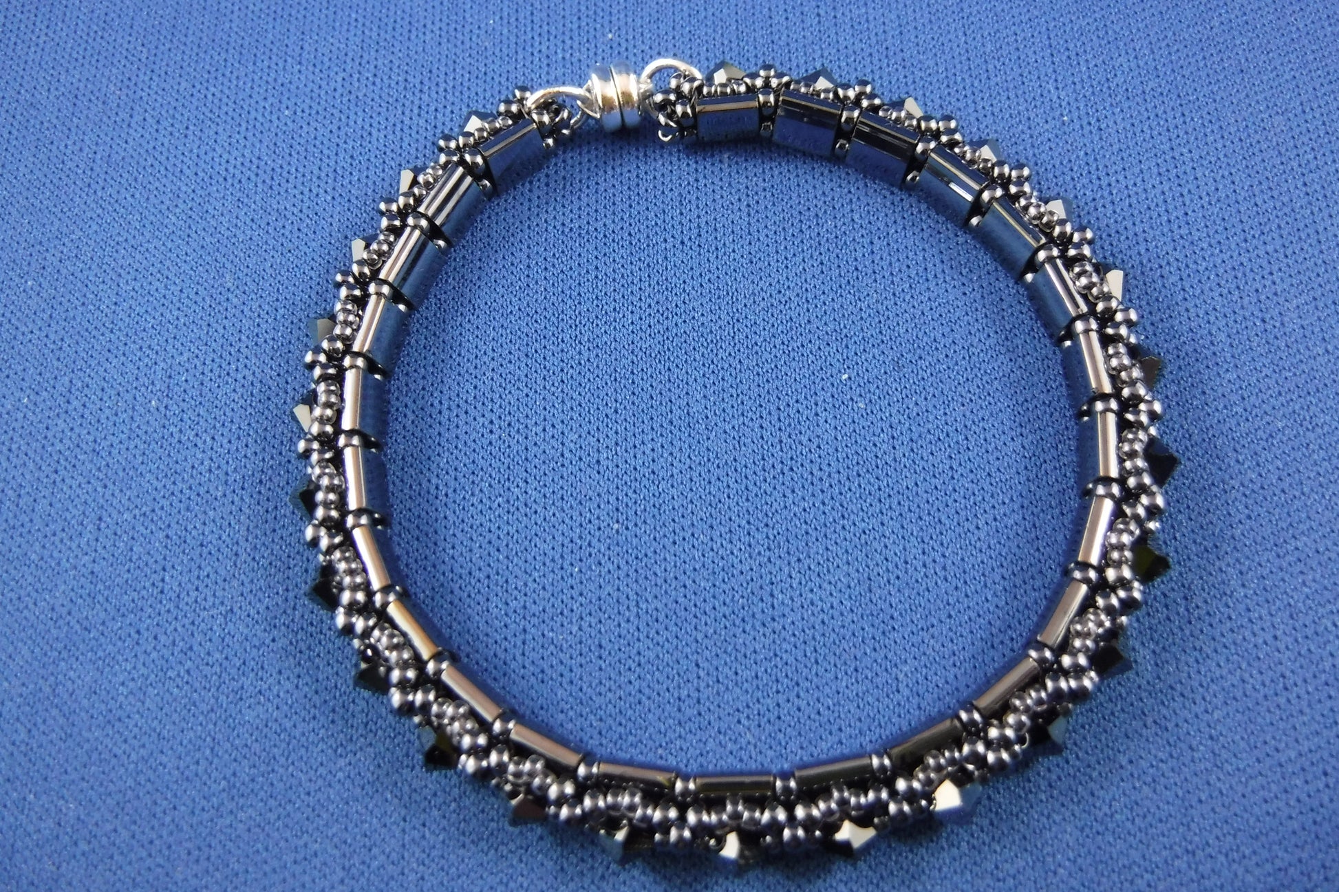 Beaded bangle bracelet with Swarovski crystals and Japanese Tila and seed beads and magnet closure (6 1/2")-gunmetal colour