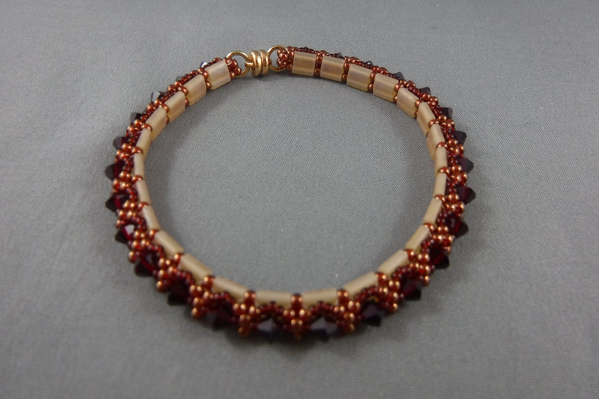 this beaded bangle bracelet has gold-toned accents showcasing beautiful red Swarovski crystals. It has a Gold-plated, strong magnet closure for easy fastening!