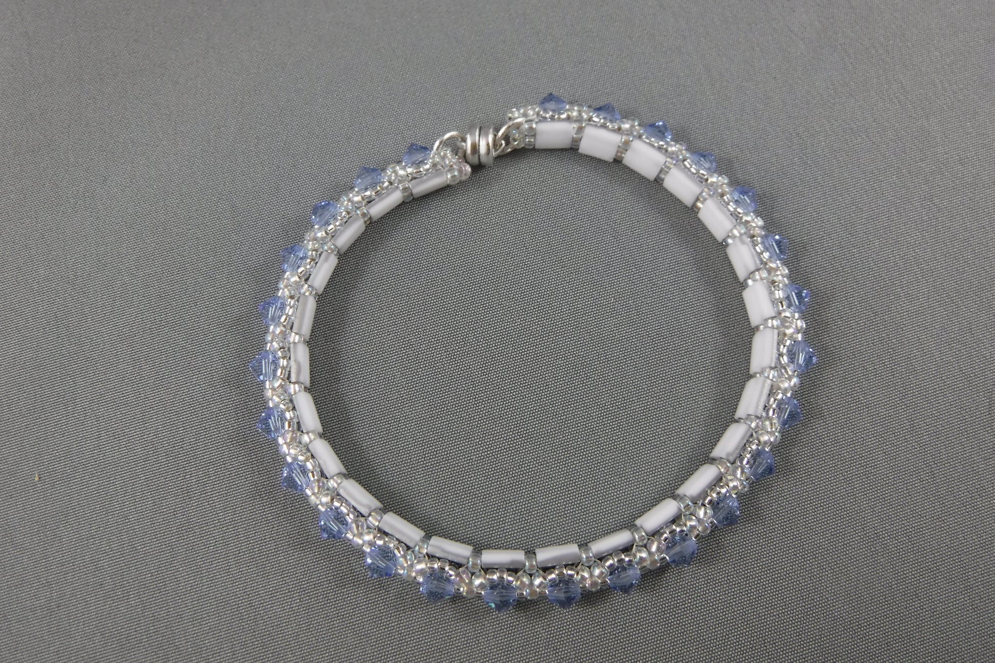 Beaded bangle bracelet with Swarovski crystals and magnet closure (6 3/4")-light blue & silver