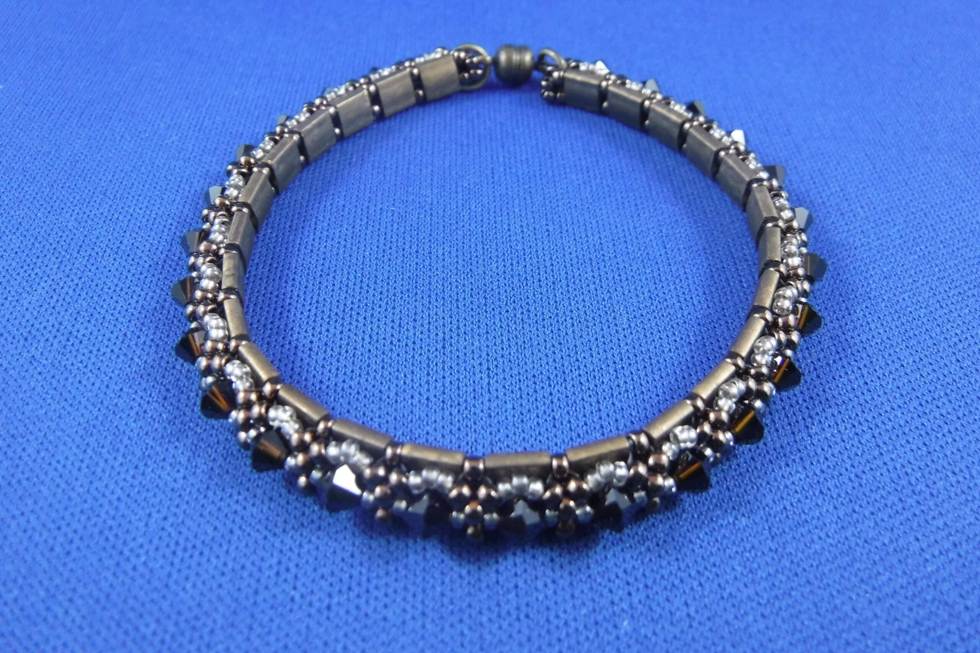 Beaded bangle with Swarovski crystals, Japanese seedbeads and magnet closure (6 3/4")-brown and bronze tones