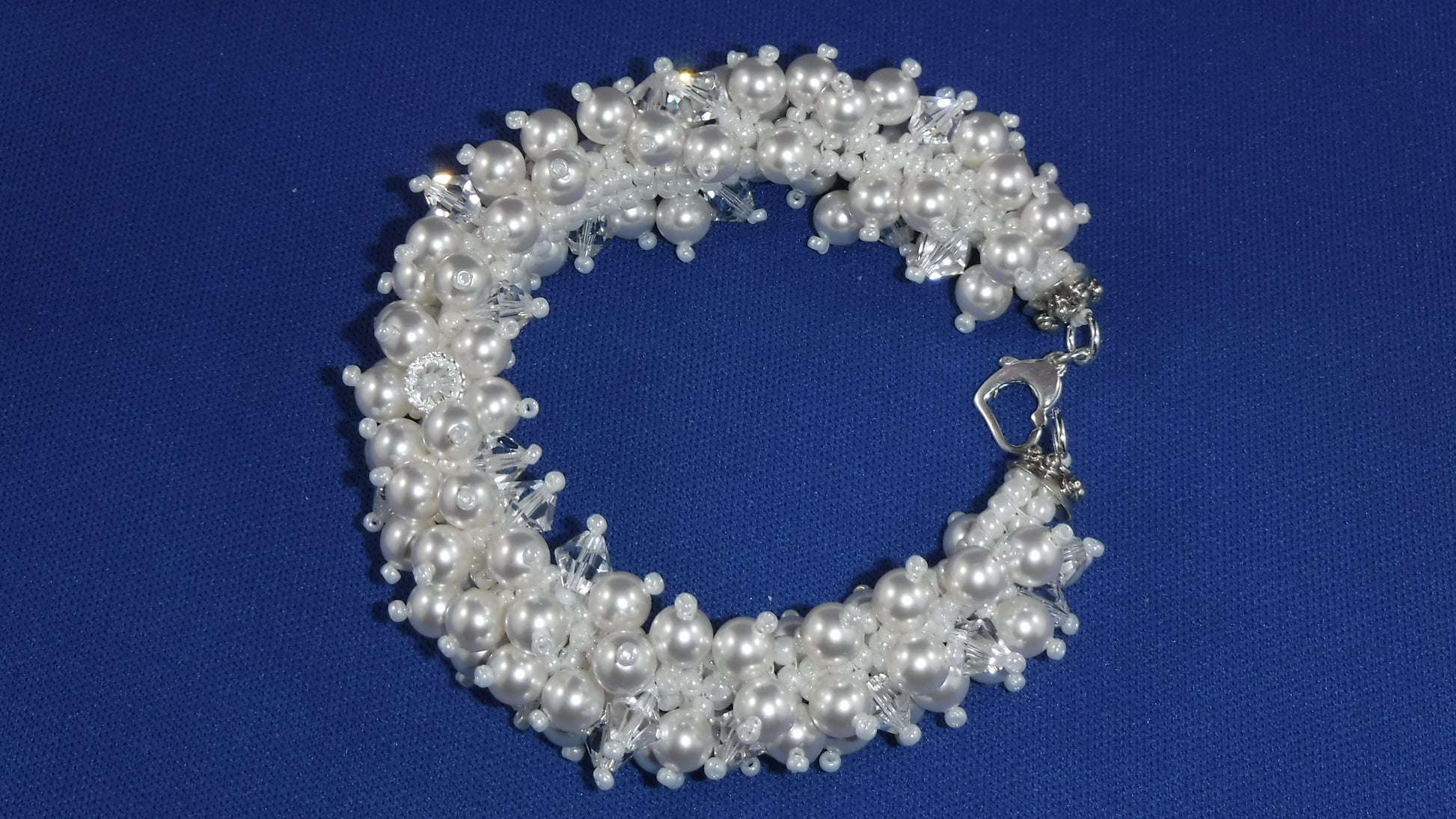Swarovski pearls and crystals, Japanese seedbeads and Sterling Silver ends and lobster (8")