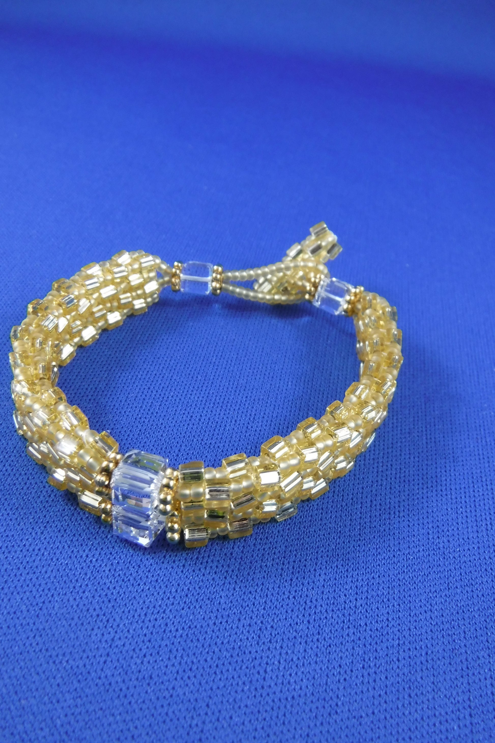 Beaded bracelet with Swarovski crystal cubes and beaded toggle closure (7 1/4")-yellow gold colour