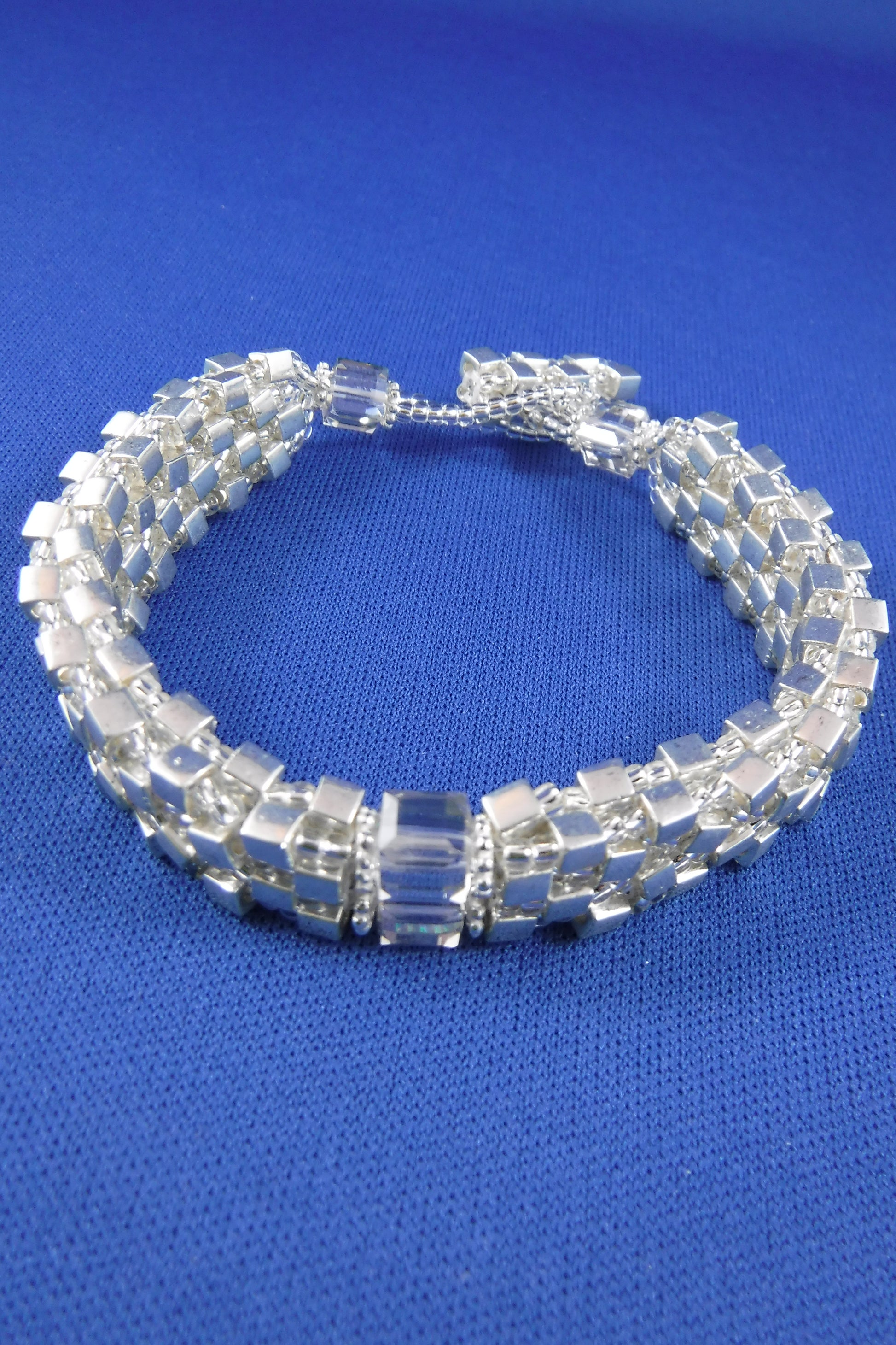 Beaded bracelet with Swarovski crystal cubes and beaded toggle closure (7 3/4")-silver colour