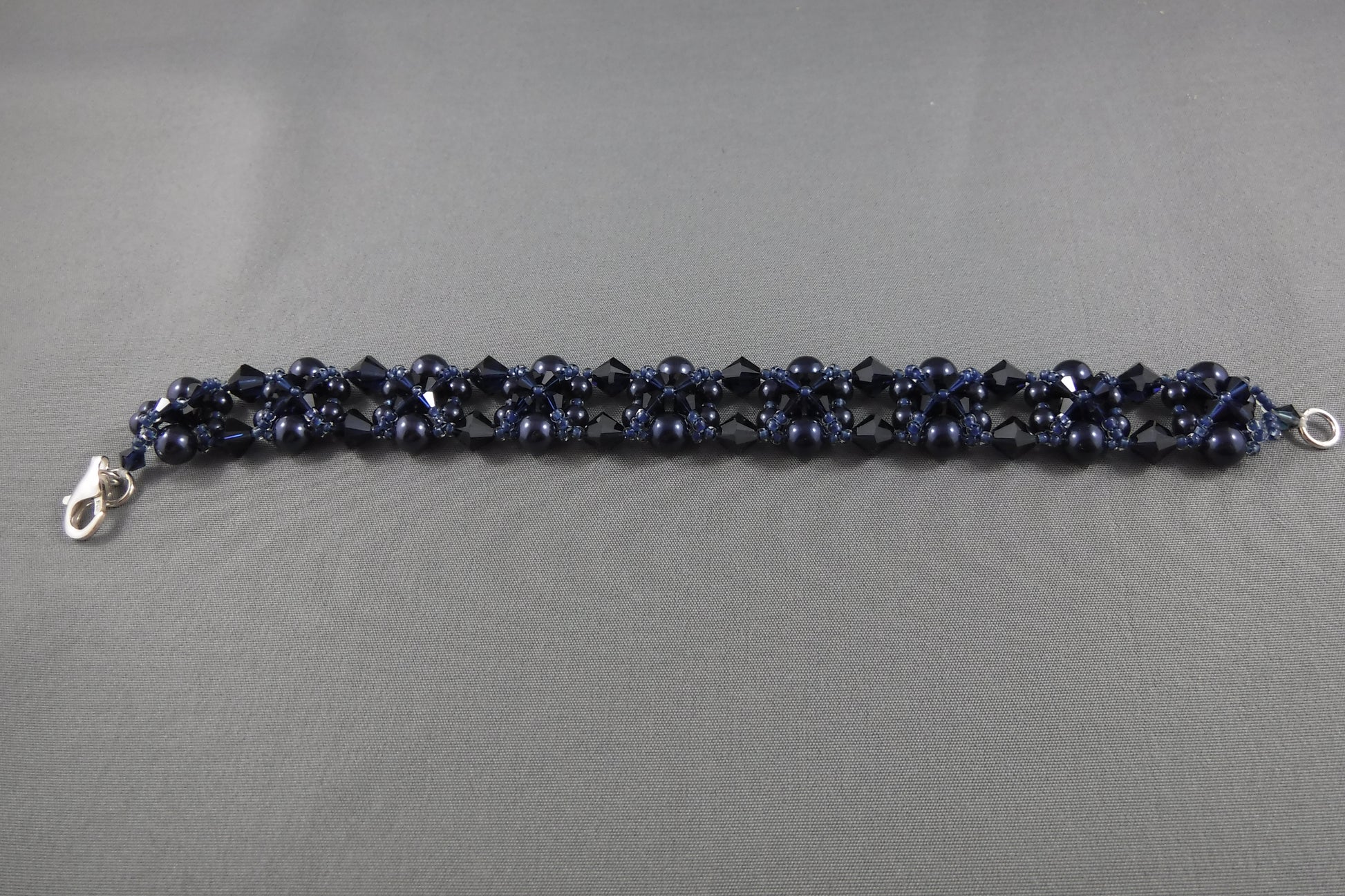 Beaded bracelet with Swarovski pearls and crystals and Sterling Silver lobster closure (8")-indigo