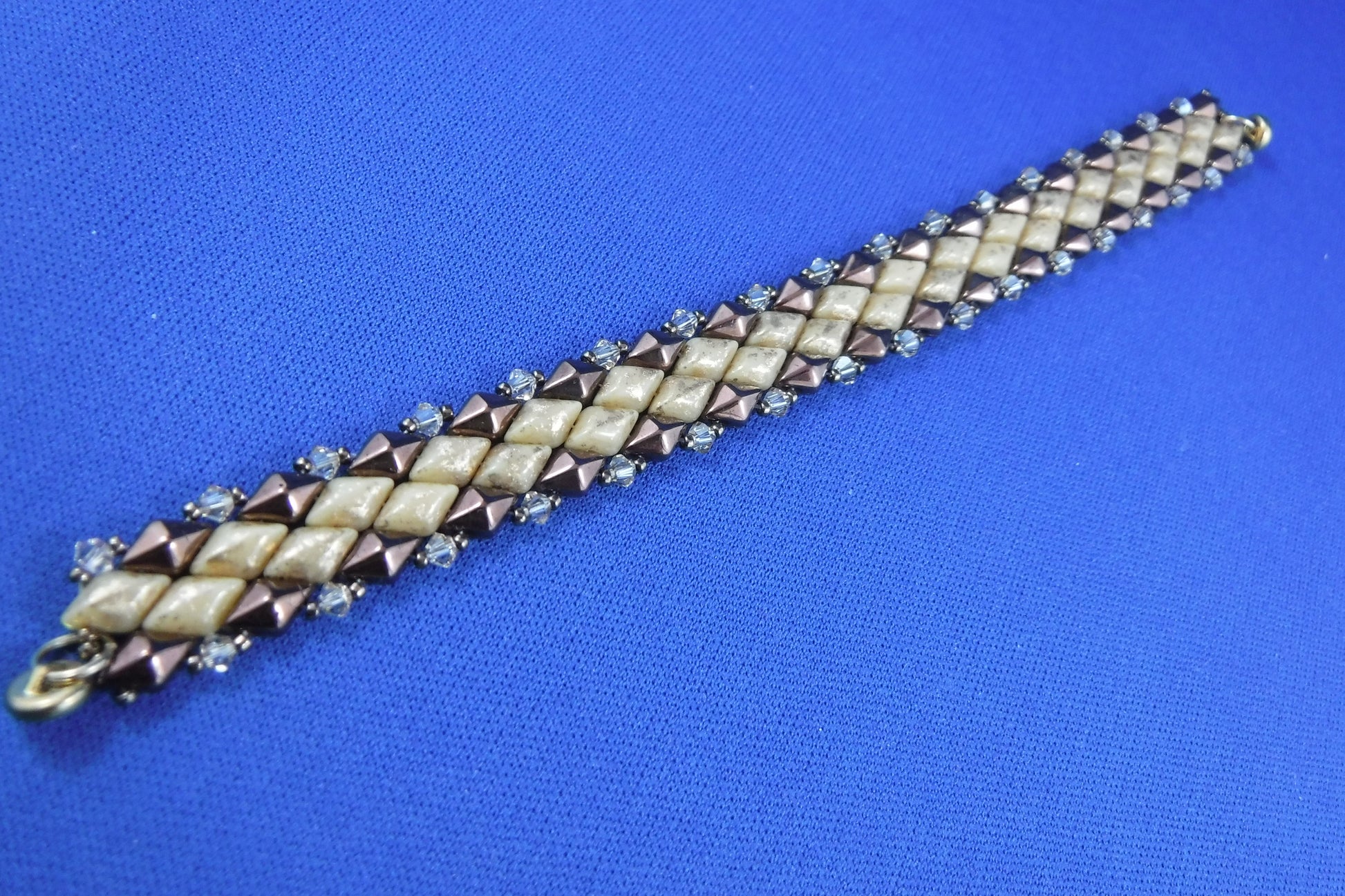 Diamond-shaped beads with 3mm. Swarovski crystal trim along the edges and gold-plated magnet closure (7" long).
