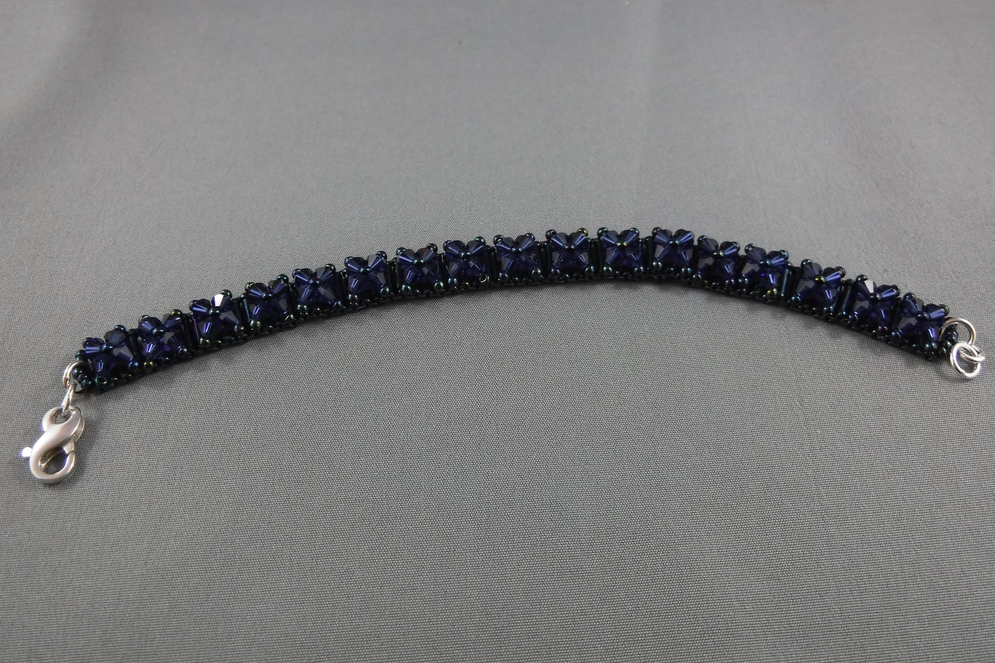 Swarovski crystals on Japanese bugle bead base with Sterling Silver lobster closure (7")- indigo blue