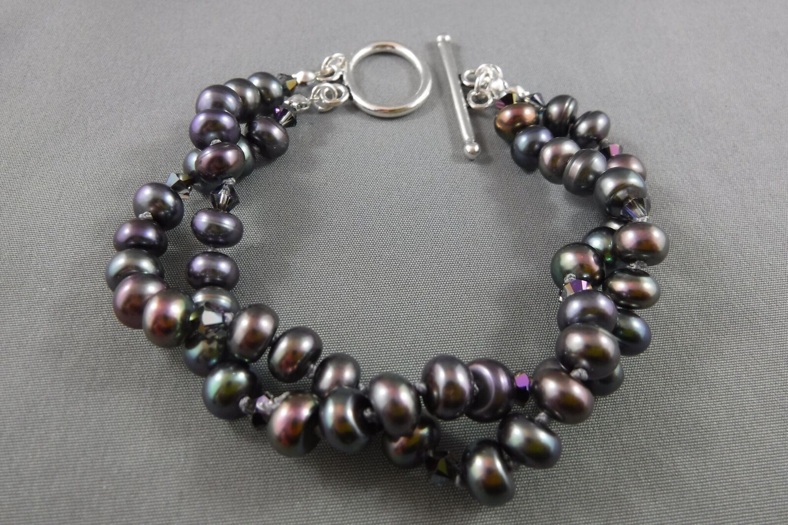Hand knotted double strand pearl bracelet with Swarovski crystals and Sterling Silver closure