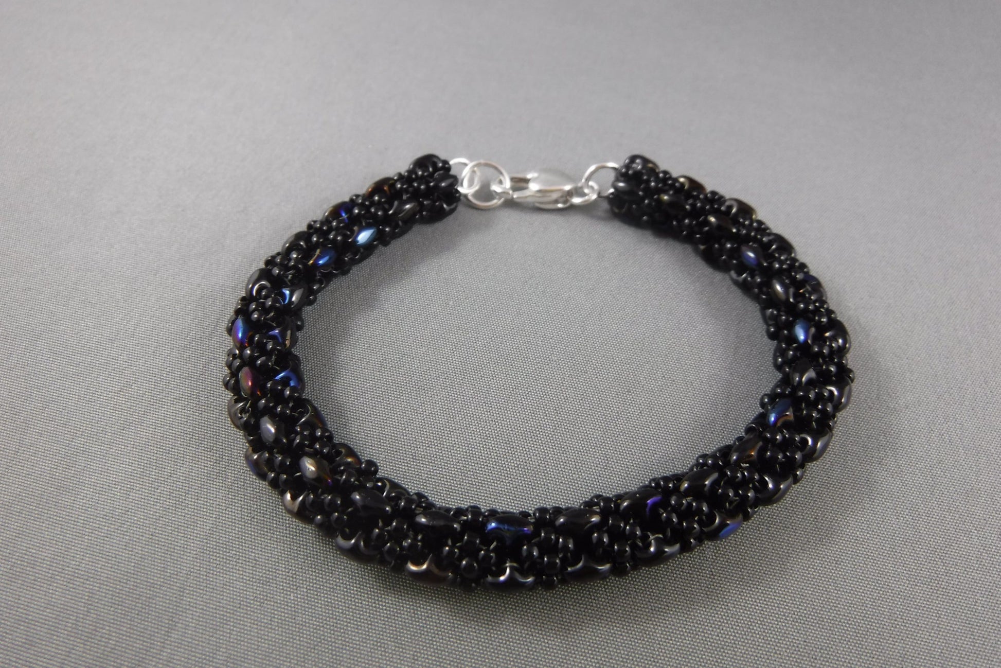 Beaded rope bracelet with Sterling Silver heart-shaped lobster (7 1/2")- black with blue accents