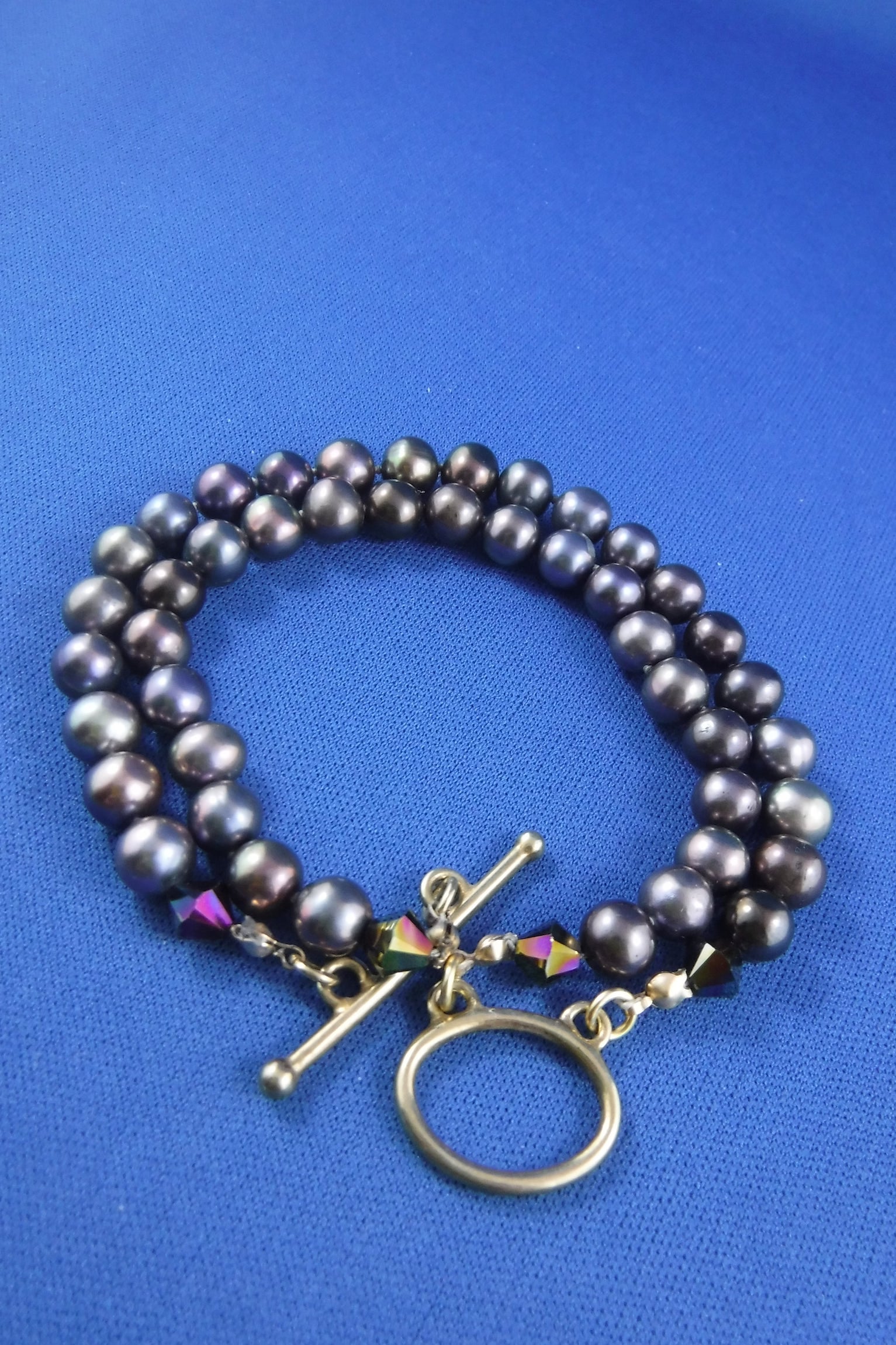 Hand-knotted freshwater pearls-double strand with gold-filled toggle (8")- deep peacock colours