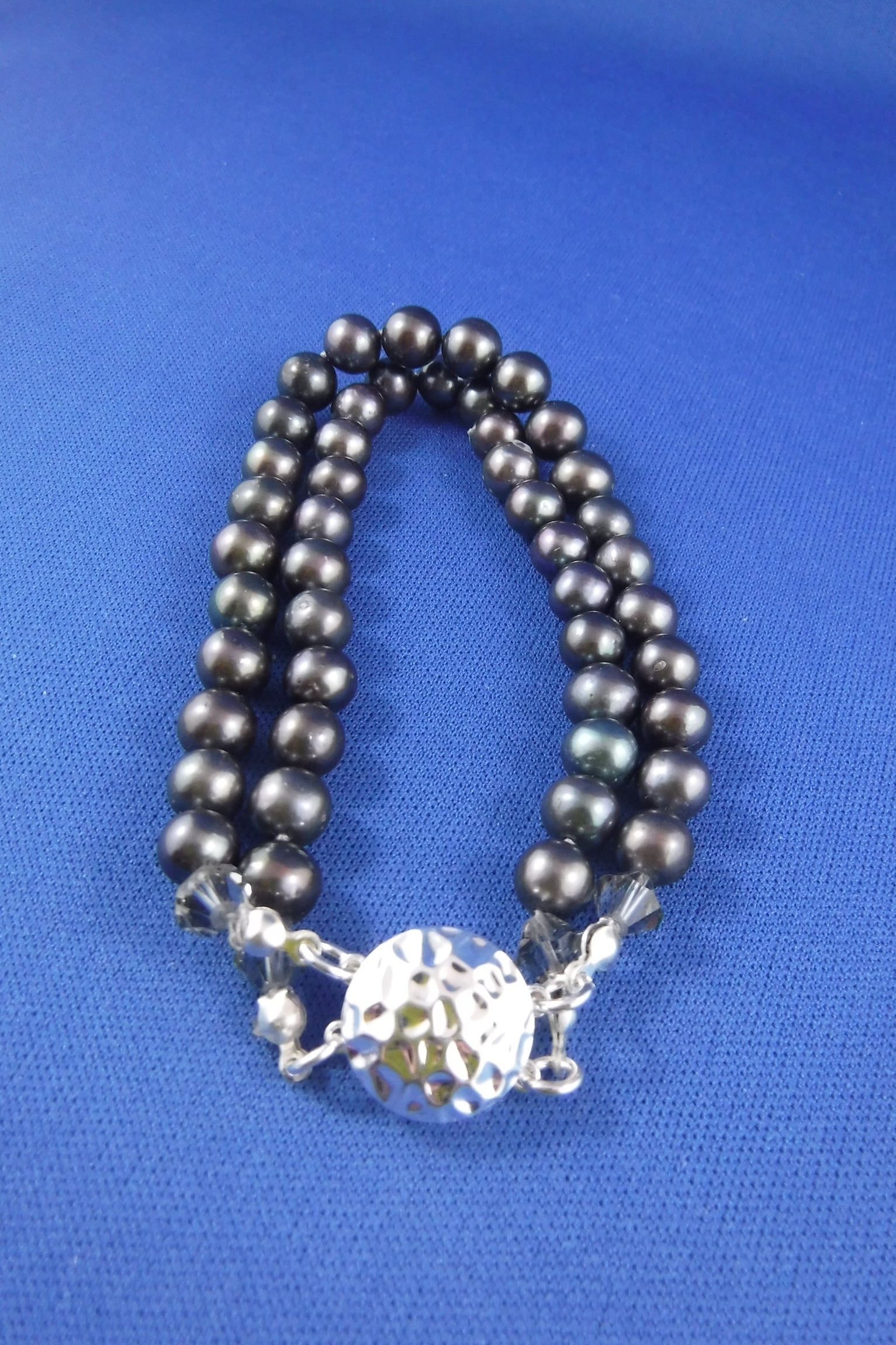Double-strand hand-kmotted freshwater pearl bracelet with sterling silver hammered Sterling Silver clasp (8")