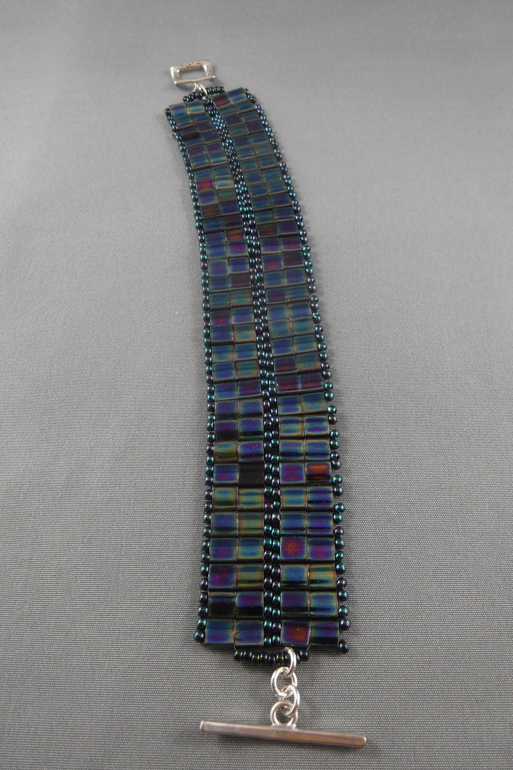 Beaded JapaneseTila and seedbead bracelet-Sterling Silver toggle closure (7 1/2" by 1")-blue/purple
