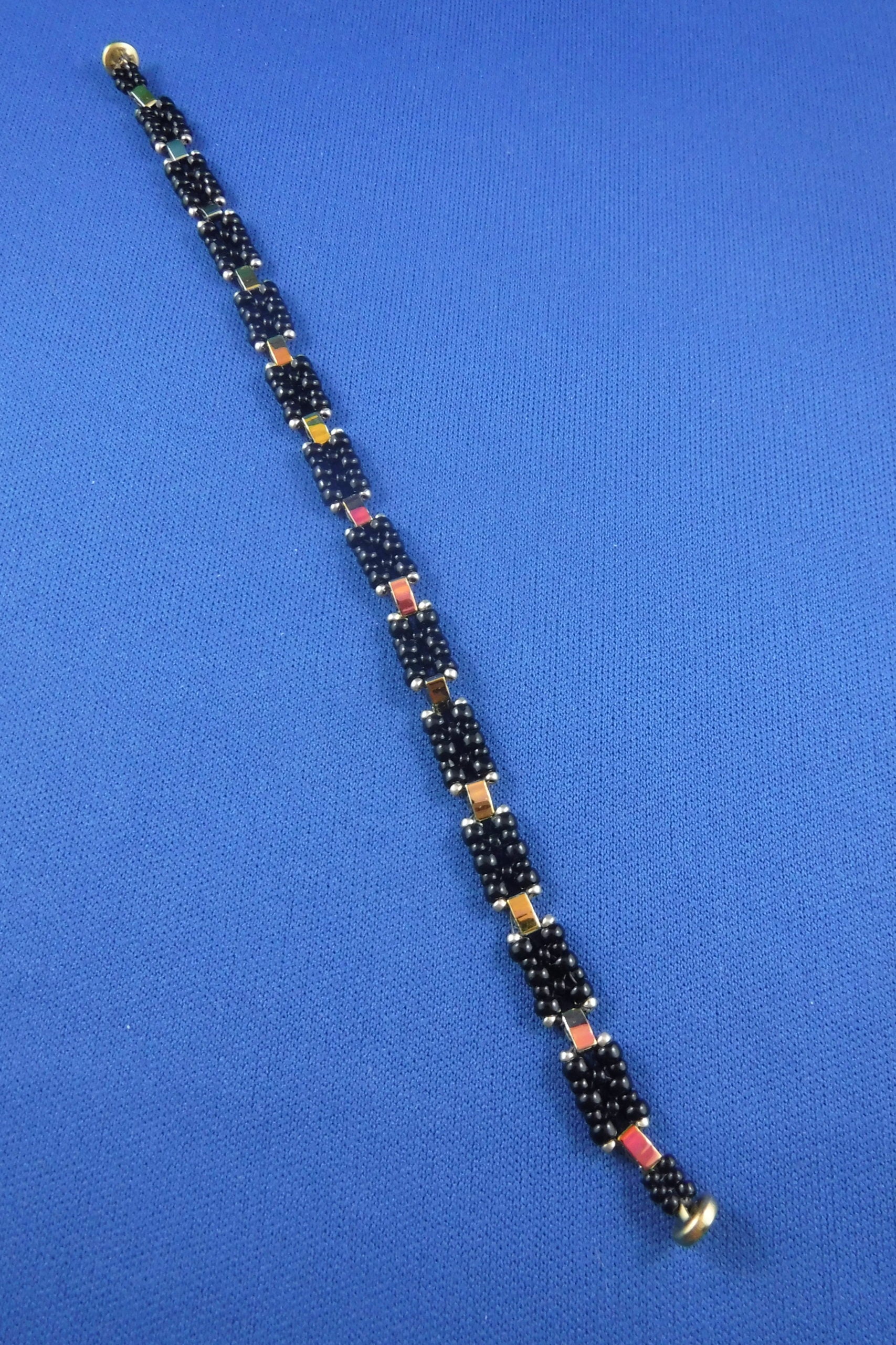 Beaded thin bracelet with Japanese Half-Tilas and seedbeads, magnet closure (7 1/4" by 5mm)- black/gold