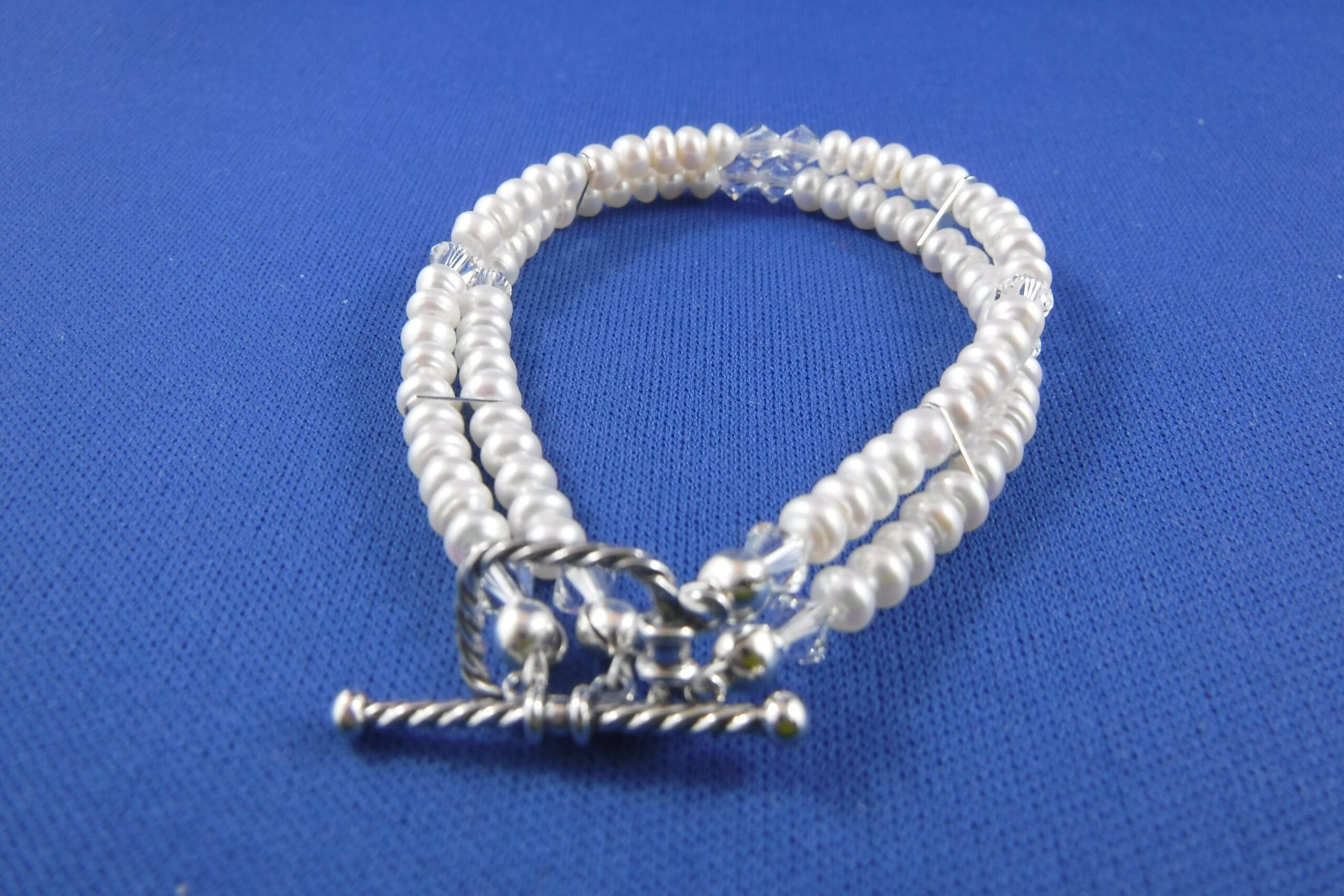 Freshwater pearls (natural white) and Sterling Silver in delicate bracelet with Swarovski crystals (7")