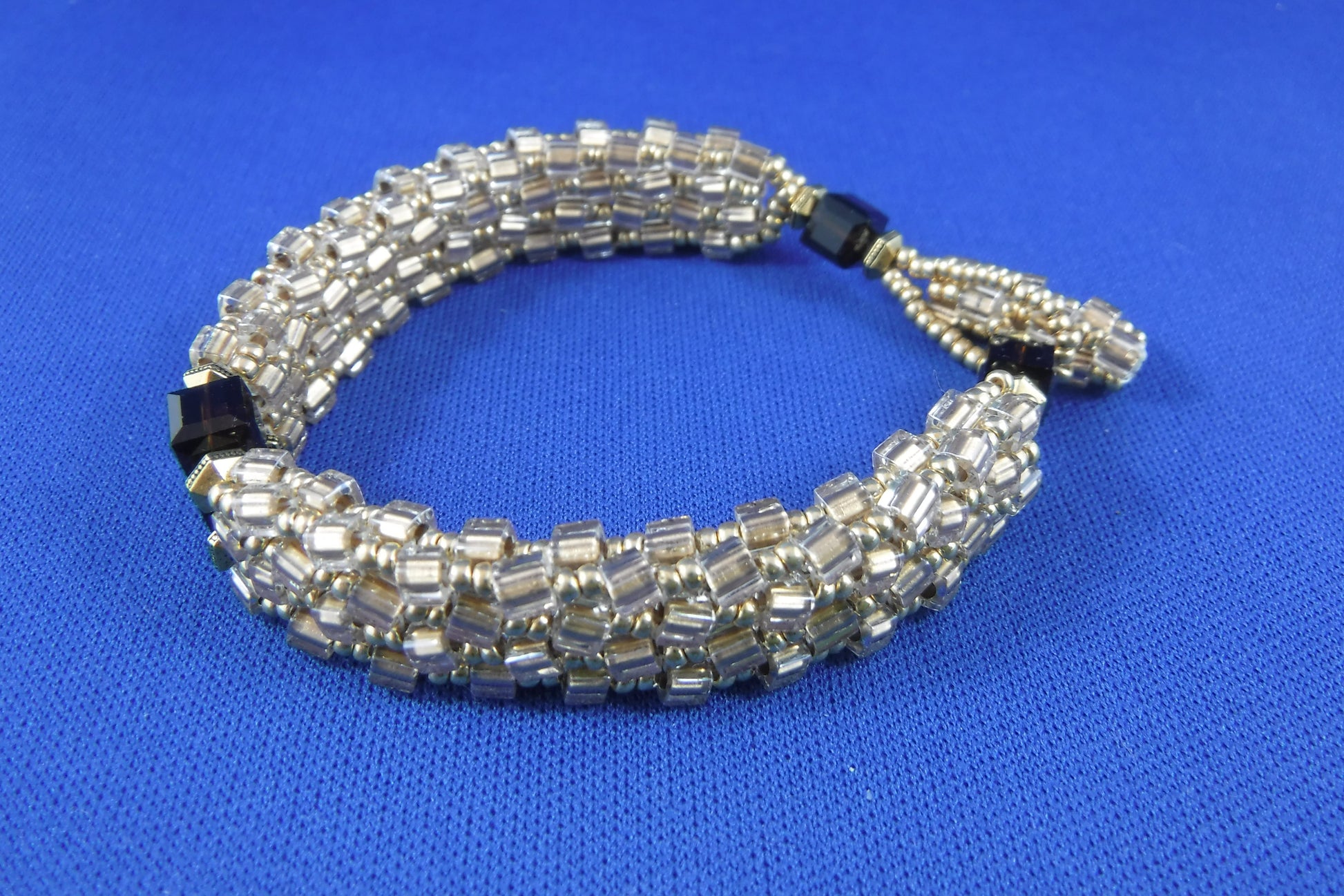 Beaded with square and round seedbeads, accented with square Swarovski crystals in the middle and at the ends. The toggle closure is beaded and metal-free (7 1/2" long and 1/2" wide).