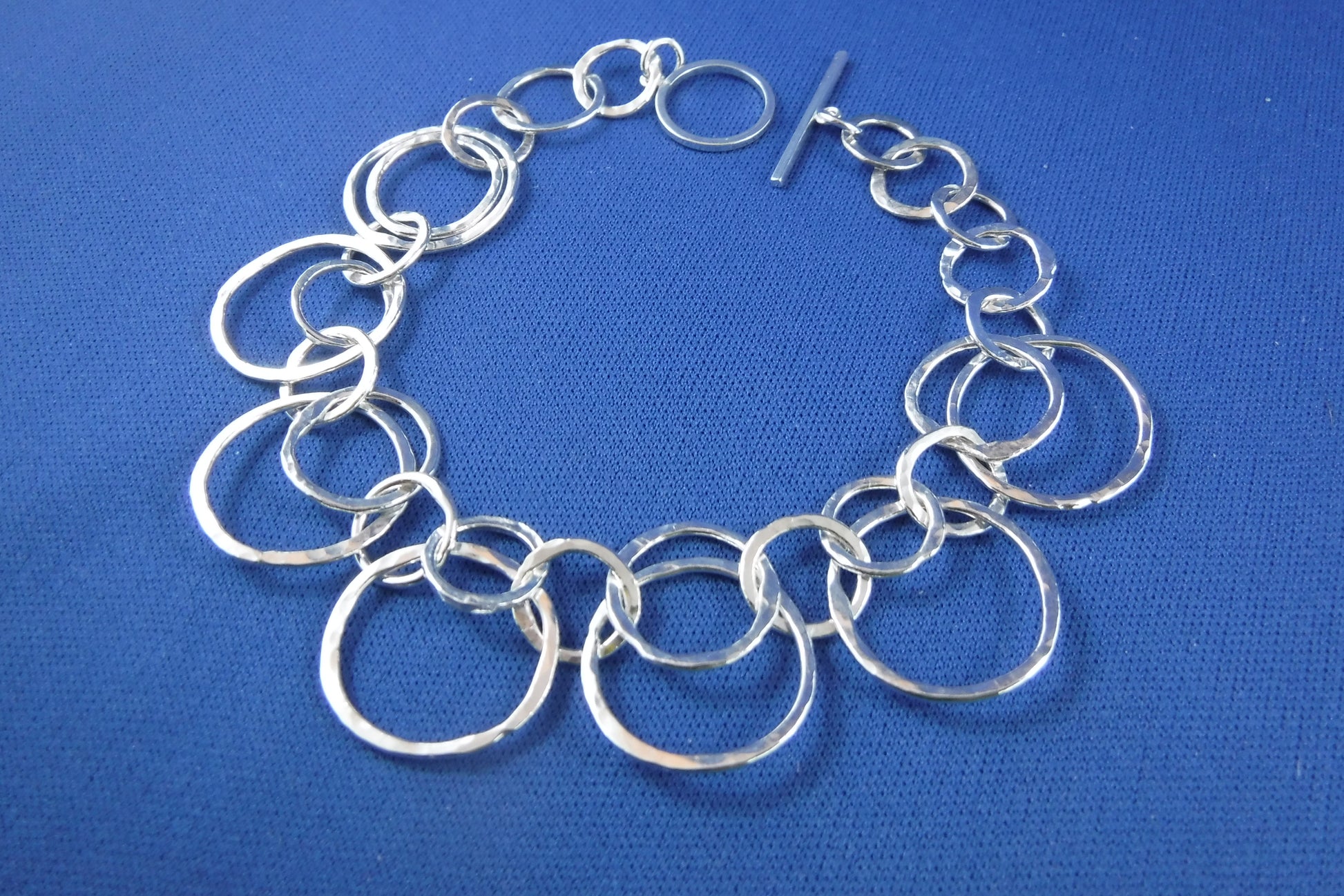 The beauty of this bracelet is compounded by its double links and the sheen of the Fine Silver. The links range in size from just under 1/2" to 3/4". The round toggle closure is Sterling Silver. (9" long, but can be closed at a link to shorten).