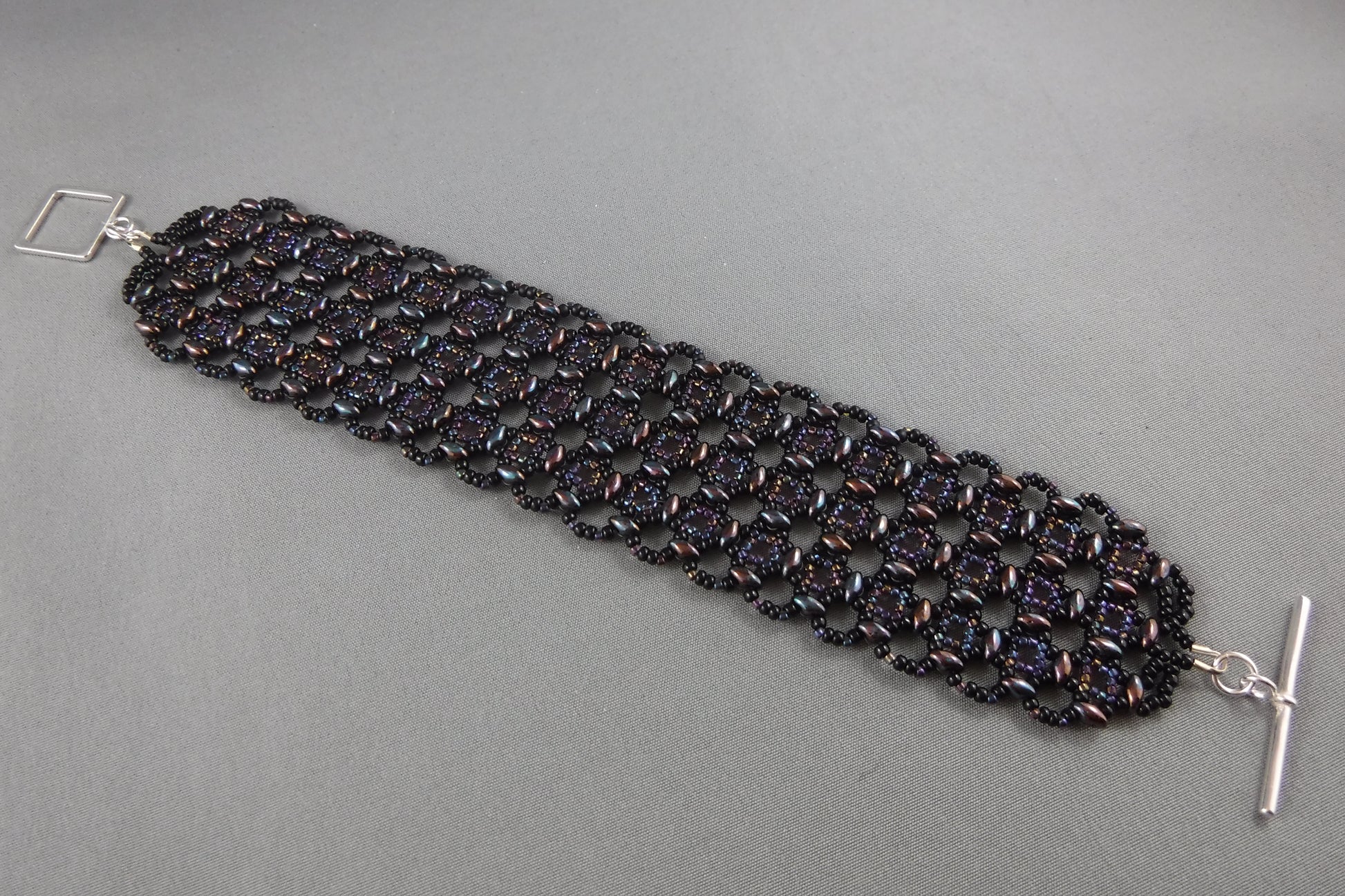 This wide cuff bracelet is created with Czech and Japanese beads, and has a Sterling Silver square toggle closure, reflecting the square bead design. It is black with slight shades of blue, purple and maroon. ( 1/2" wide and 8 3/4" long).