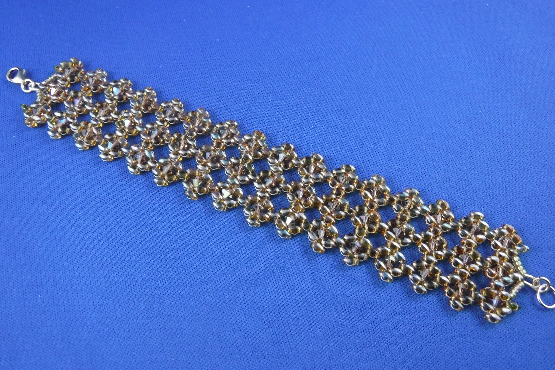 This wide cuff bracelet has a diamond pattern created with Czech beads and Swarovski crystals, that subtly reflect multiple colours. It has a Gold-filled small lobster closure.