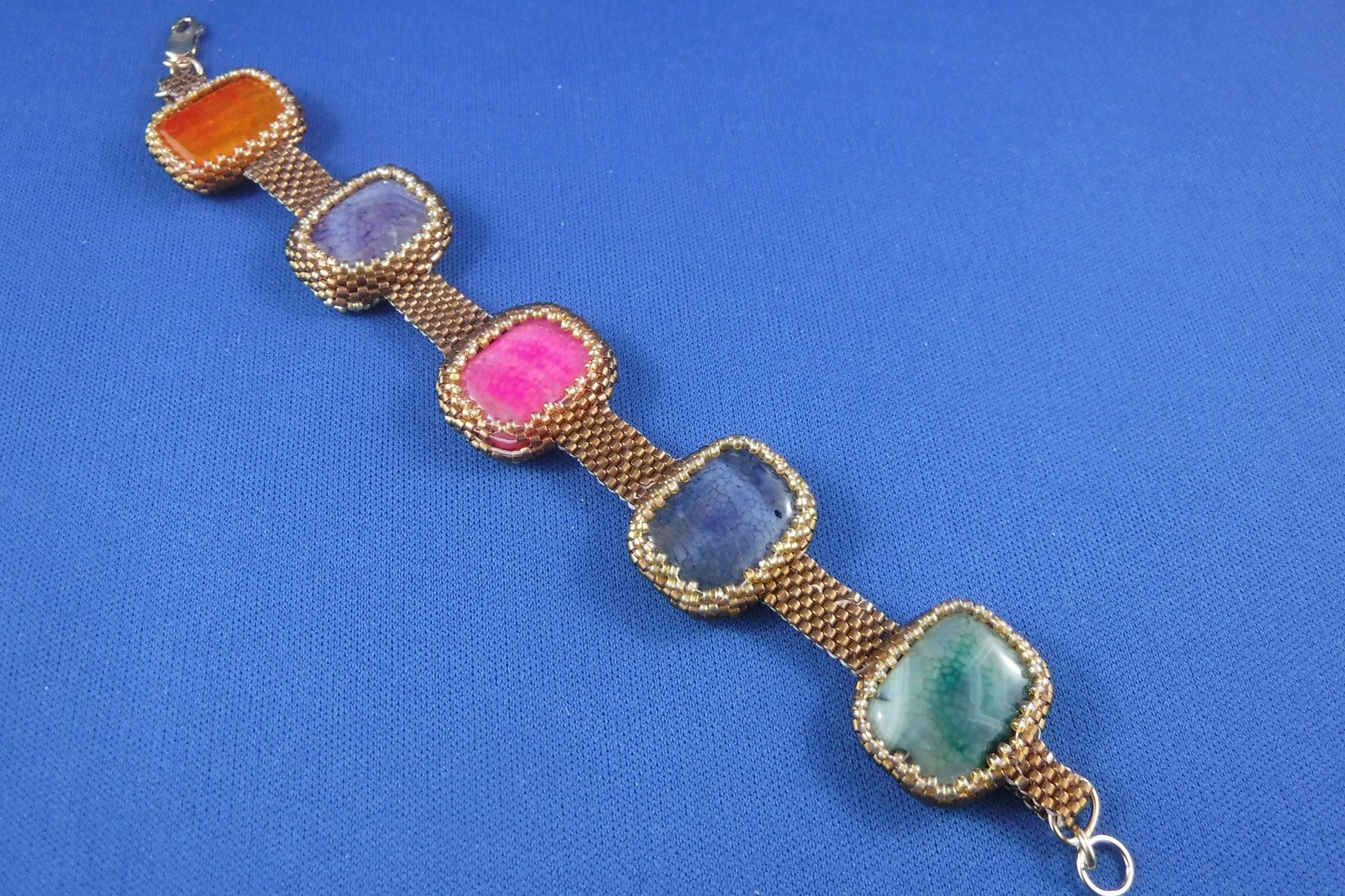 Jewel-toned Agate rectangular stones are featured in this statement bracelet, beaded with Japanese beads and closed securely with a Gold-filled elongated lobster.