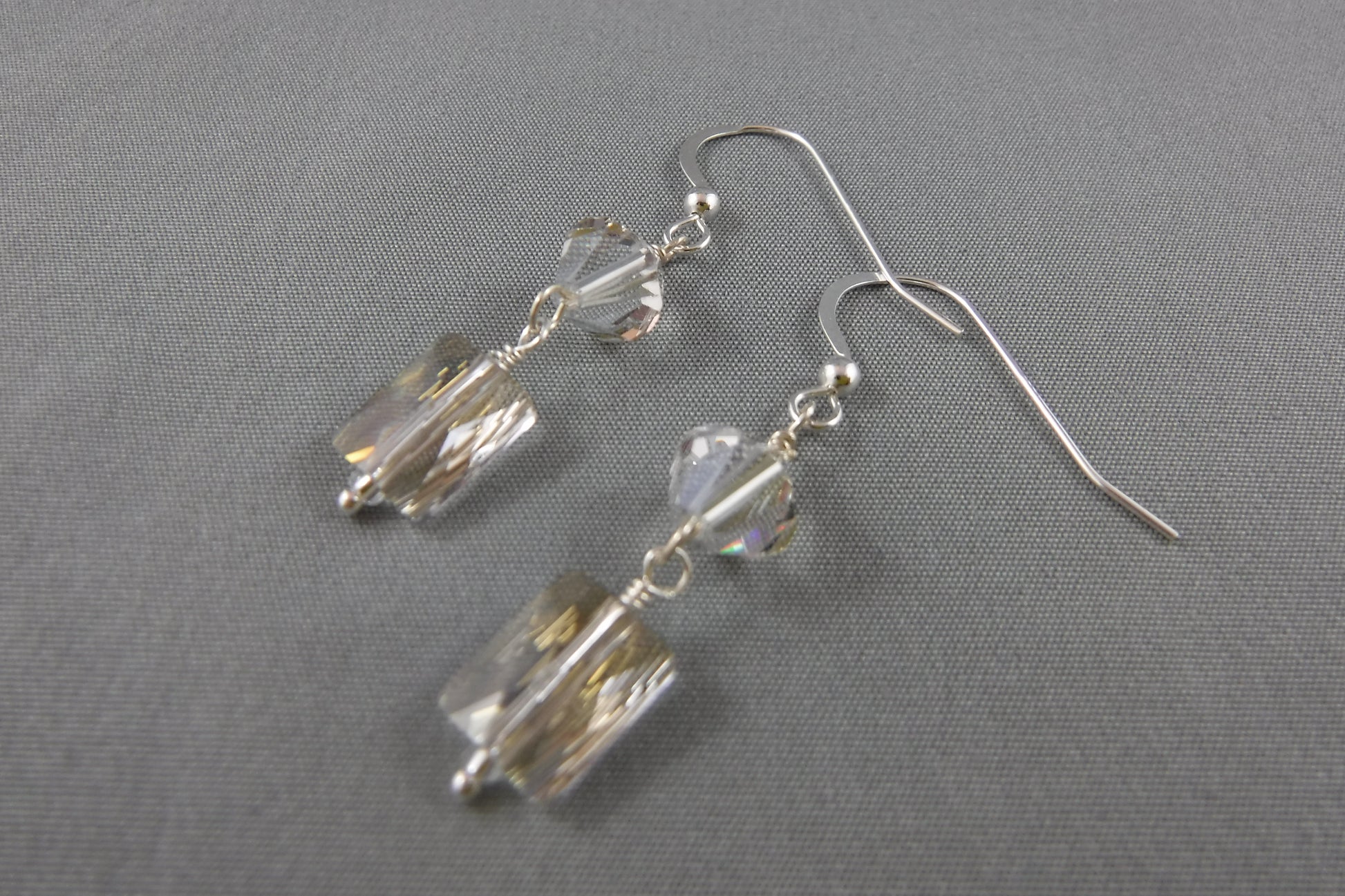 "Silver Shade" Swarovski crystals: faceted rectangles and bicones, with Sterling Silver ear wires