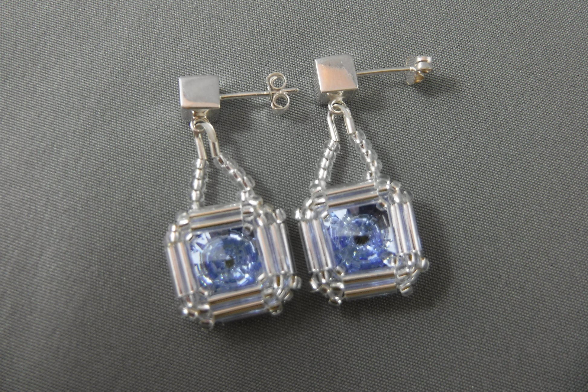 Swarovski "Light Sapphire"-coloured crystals are framed with Japanese bugle and seed beads, to create a square, on square Sterling Silver studs. (1 1/8" long).