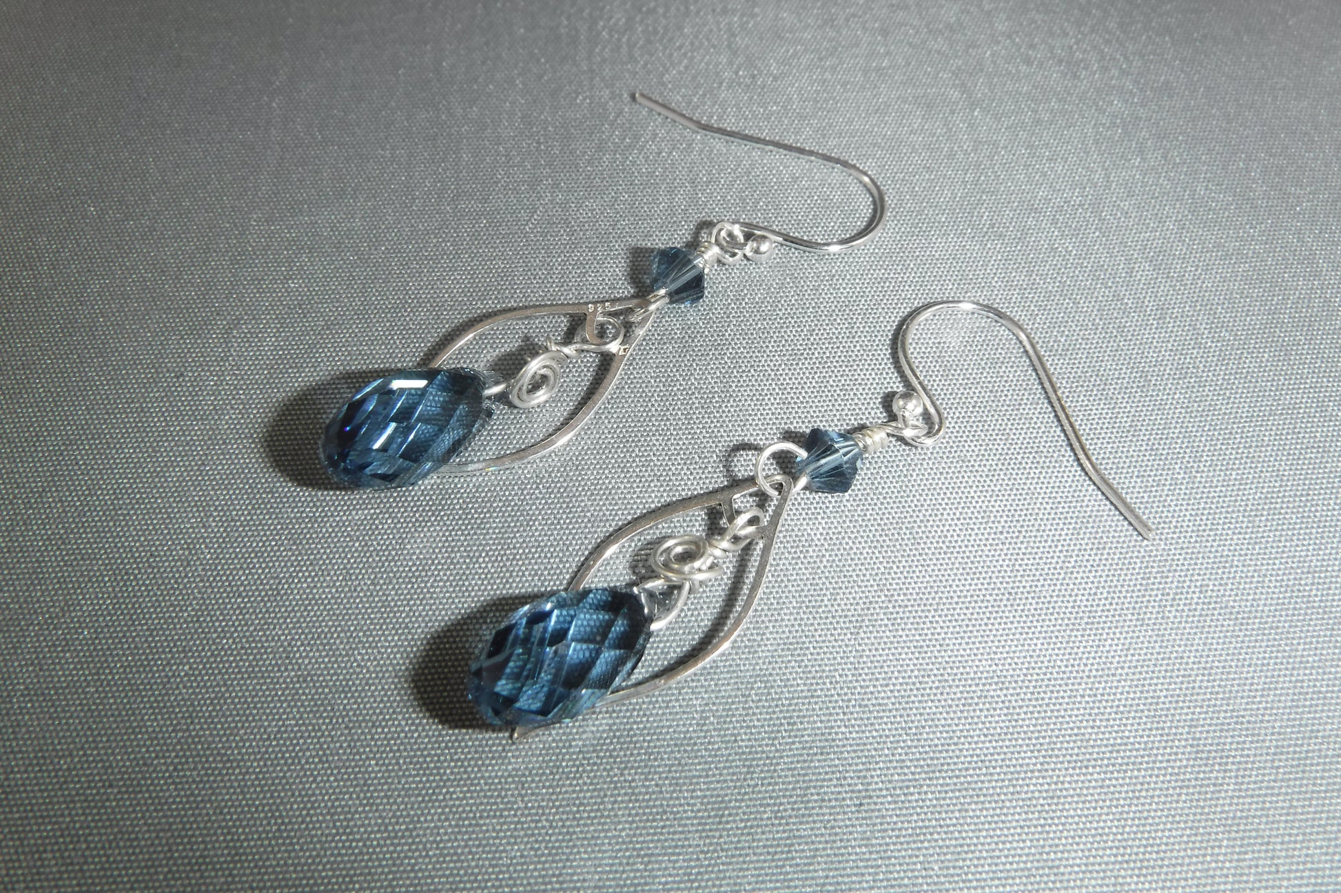Sterling Silver marquise-shaped frames with "Denim Blue -coloured Swarovski crystal teardrops and Sterling Silver ear wires. (1 3/4" long)