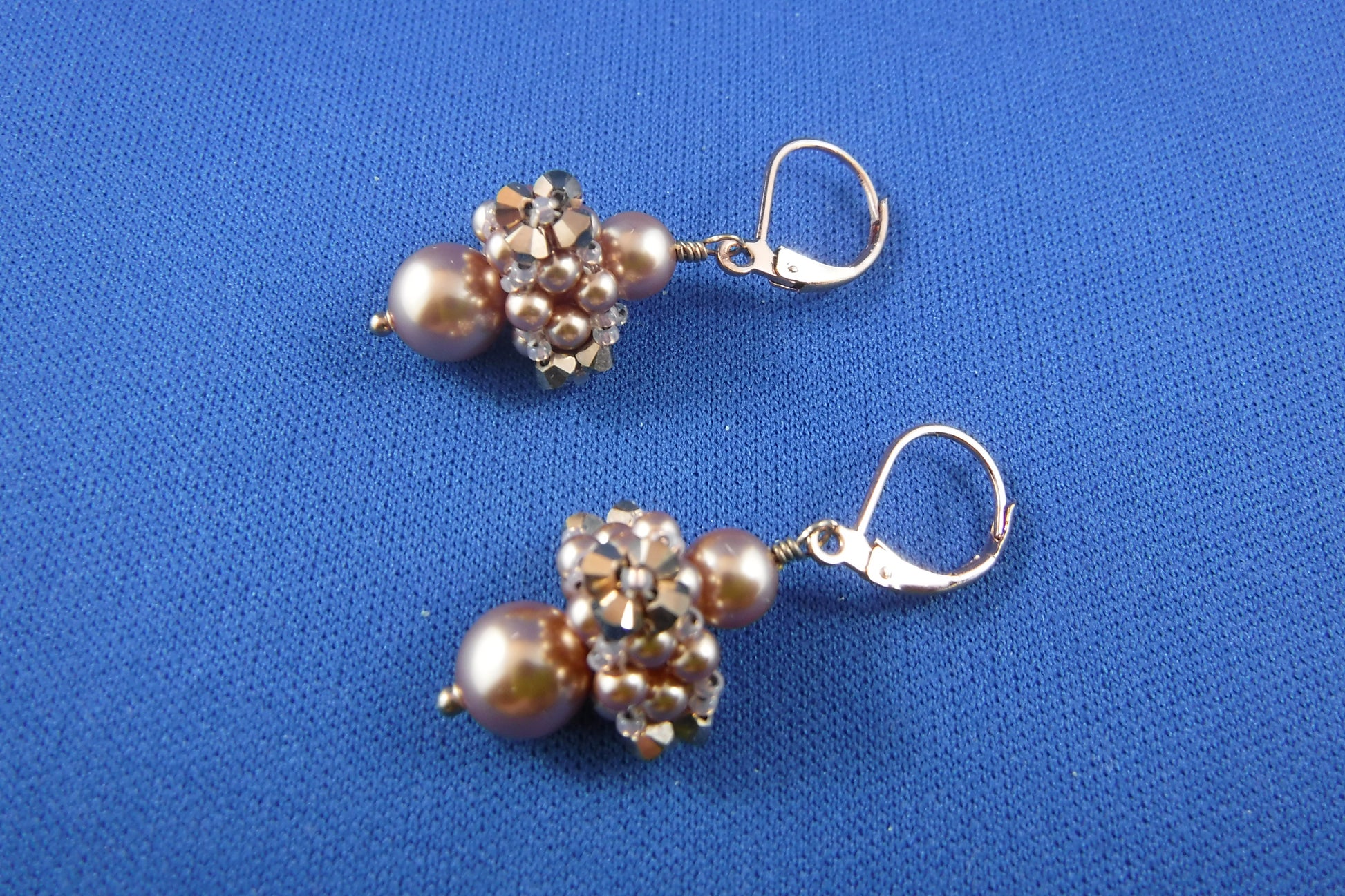 Triangular beads created with Swarovski Pearls and crystals, set between 6mm and 8mm Swarovski Pearls, with Rose-Gold-plated French ear wires (1 1/2" long).