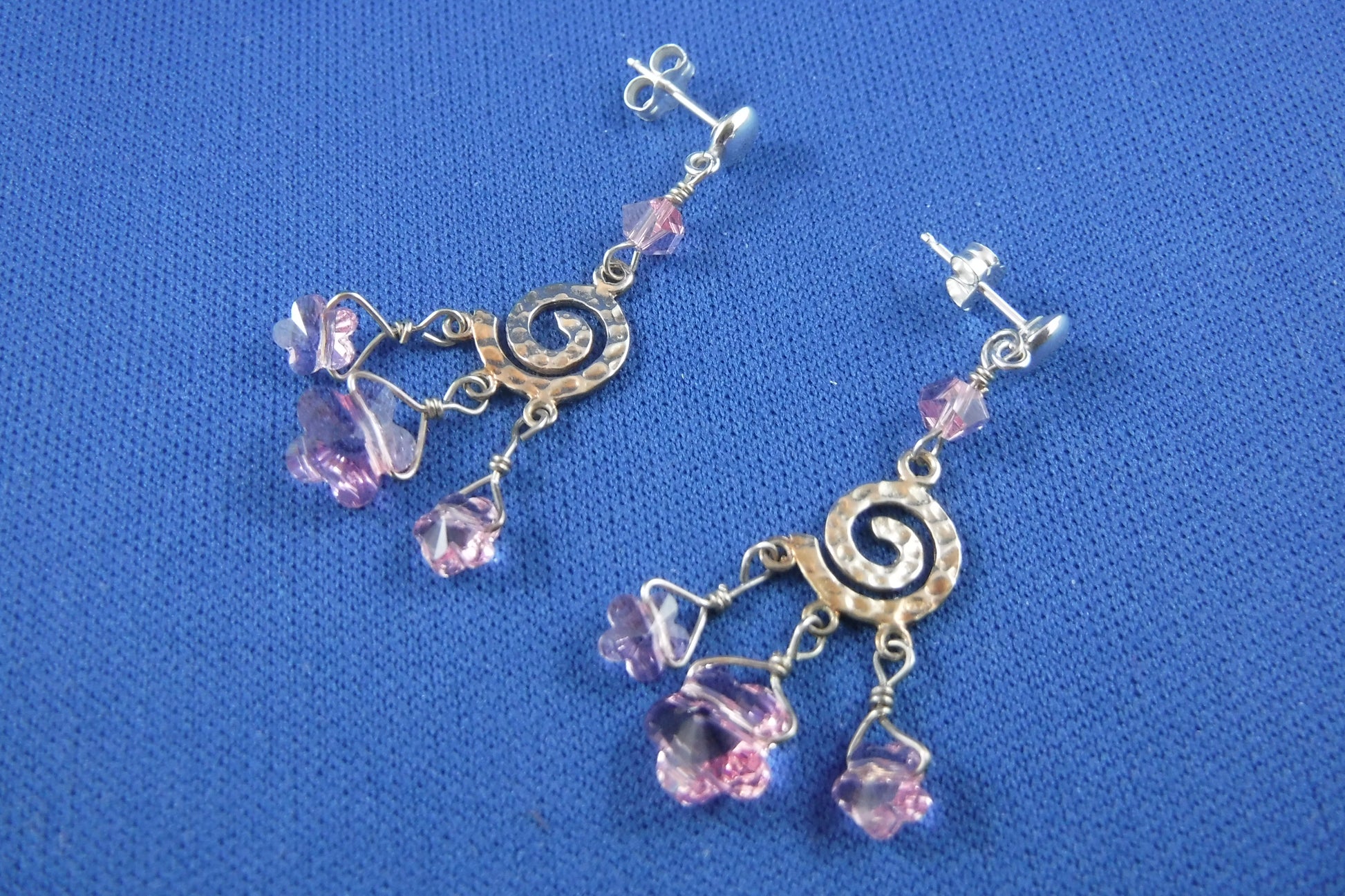 Sterling Silver swirls with "Light Rose" Swarovski crystal flowers, and round, flat (4mm) studs