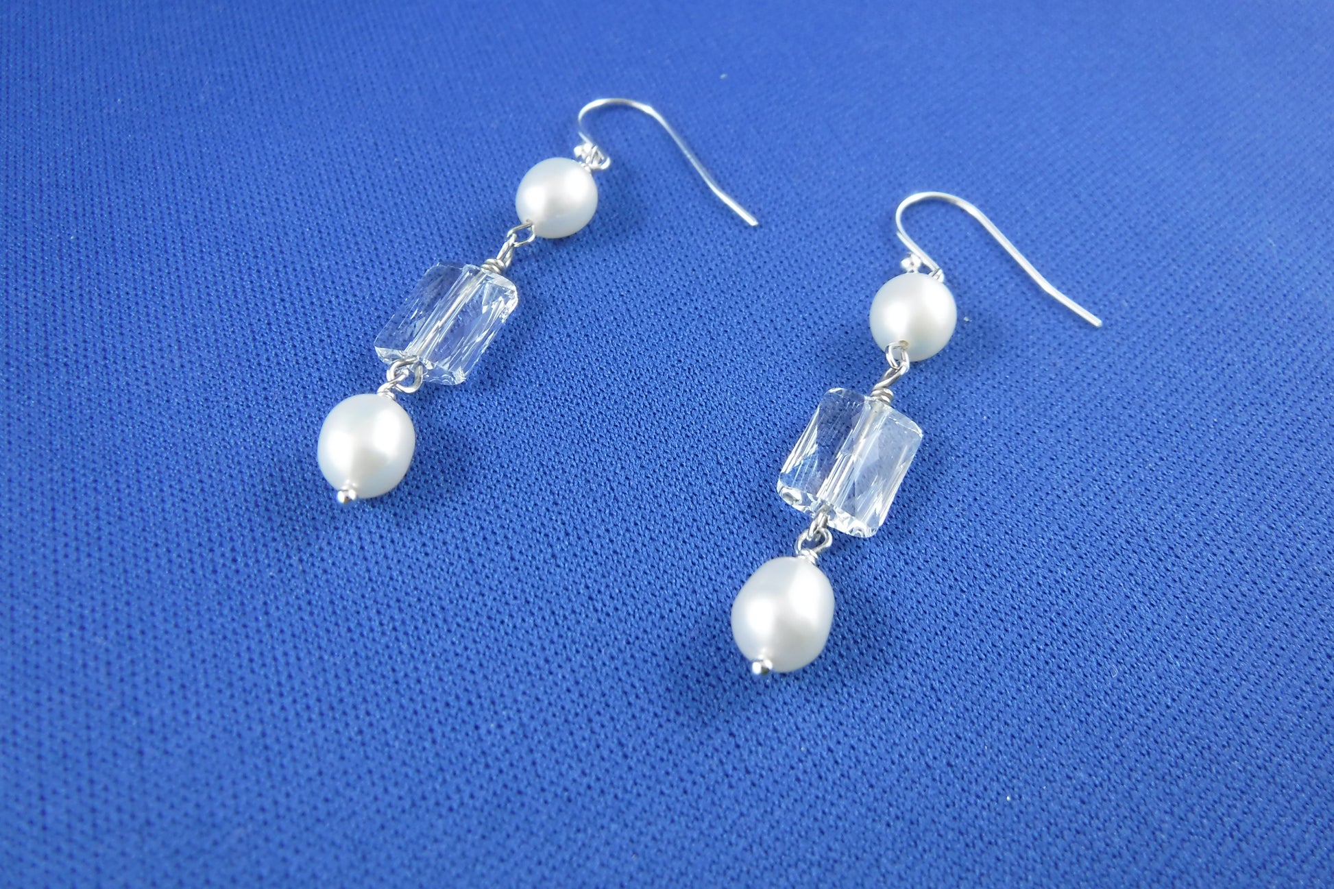 Freshwater Pearls and faceted Swarovski clear crystal rectangles (7 by 10mm.) with Sterling Silver ear wires (2" long).