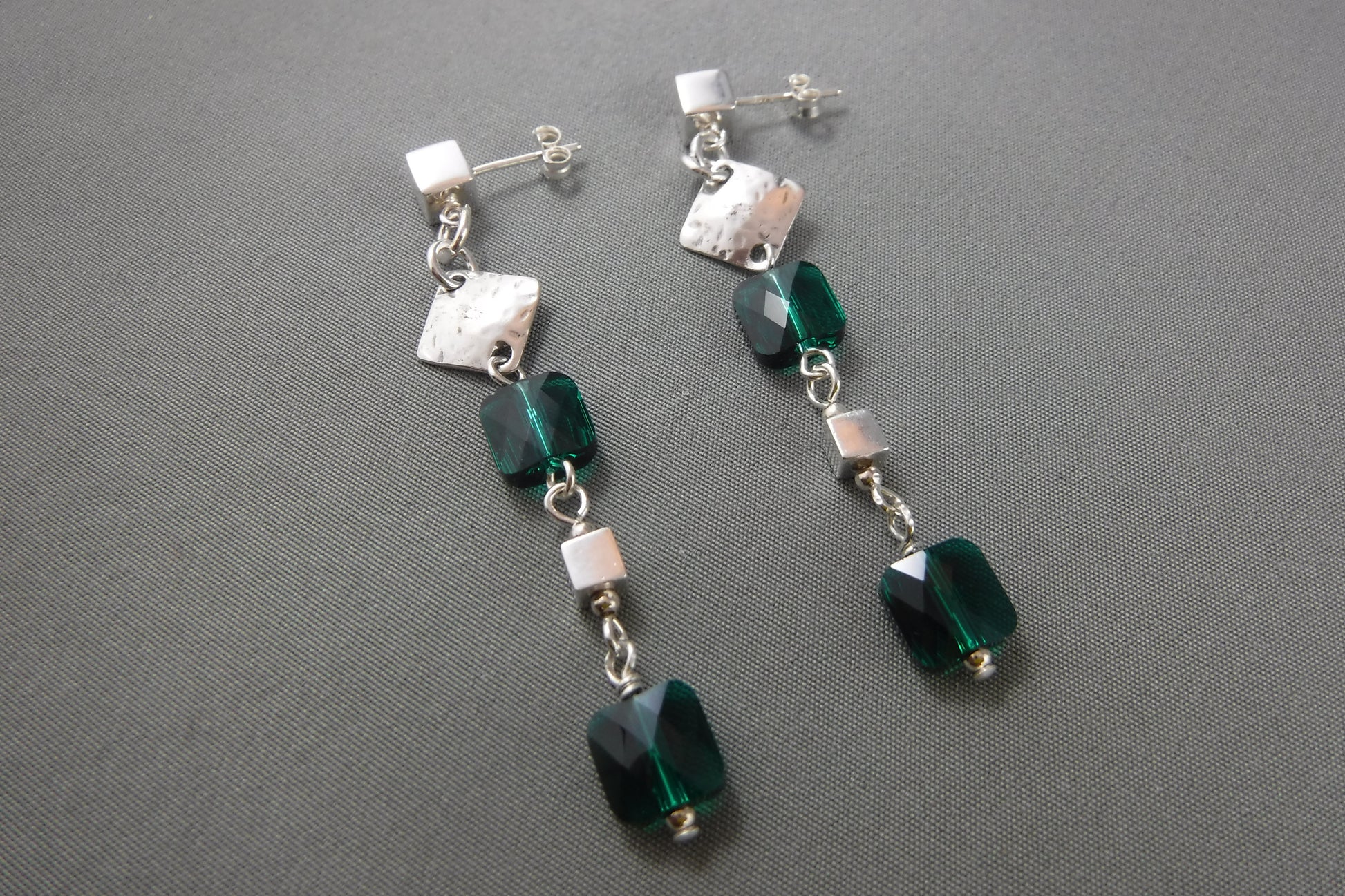 These earrings accent faceted emerald-coloured Swarovski crystal squares with square Sterling Silver beads, 5mm studs and hammered diamond-shapes. They are long and delicate!