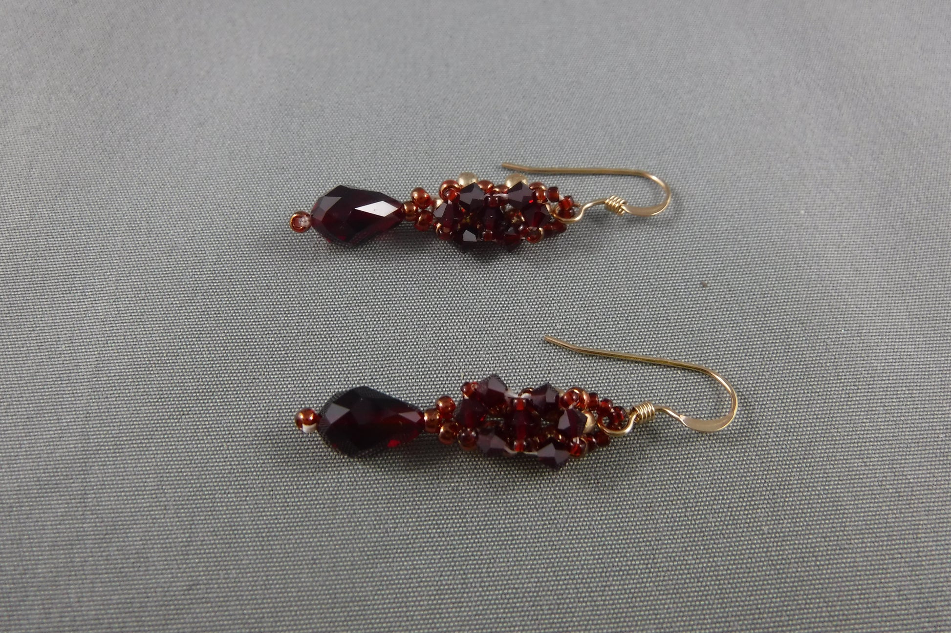 these elegant earrings are created with Swarovski teardrop crystals and 3mm. bicones, Japanese seed beads and Gold-filled ear wires . They are 1 1/2" long, up to 1/4" wide, and match the style and colour of necklace N-515 ("Siam" red).