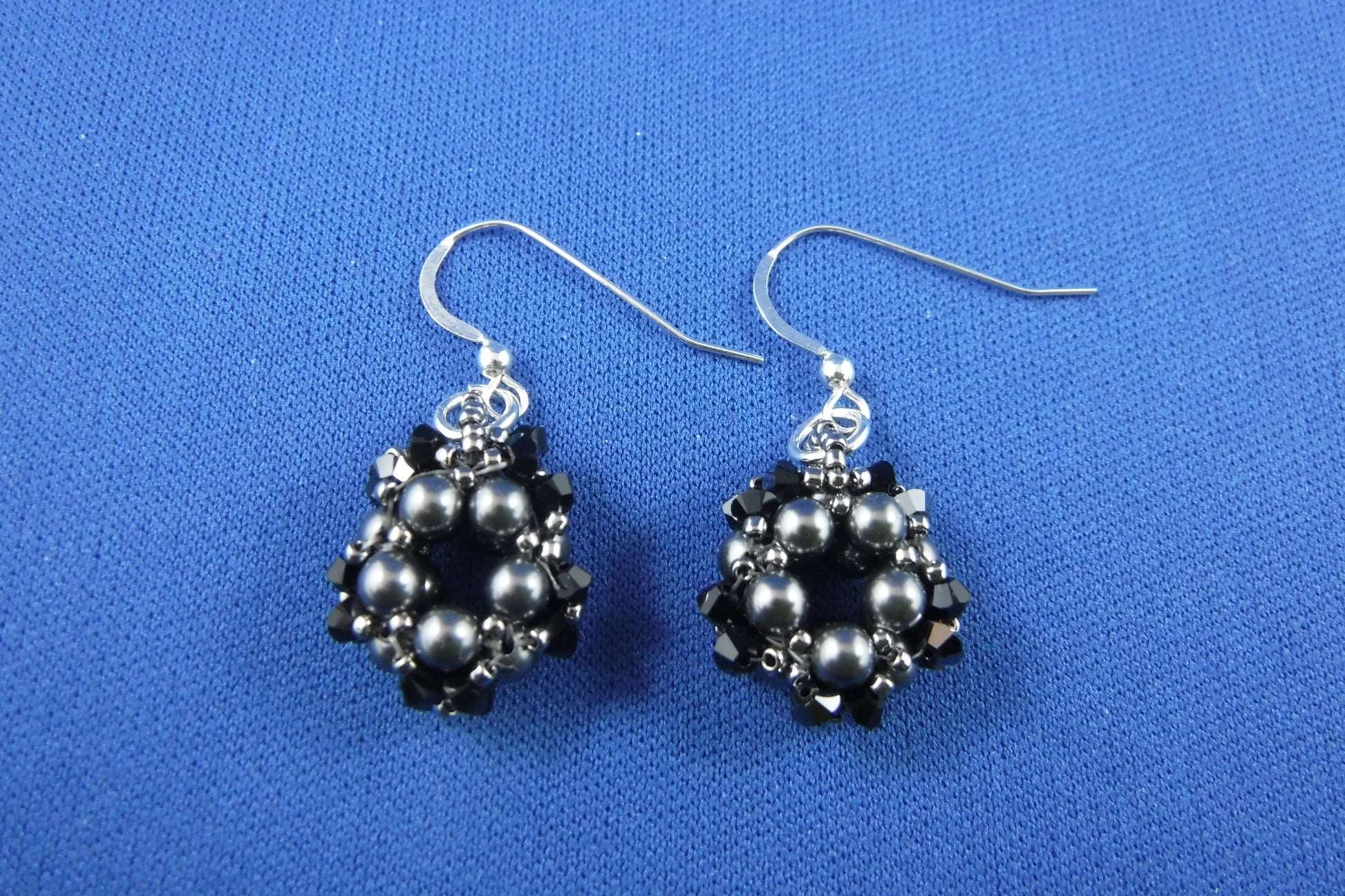 Hand beaded earrings with Swarovski pearls and crystals, Japanese seed beads and Sterling Silver ear wires and chain. (Dark grey and black)