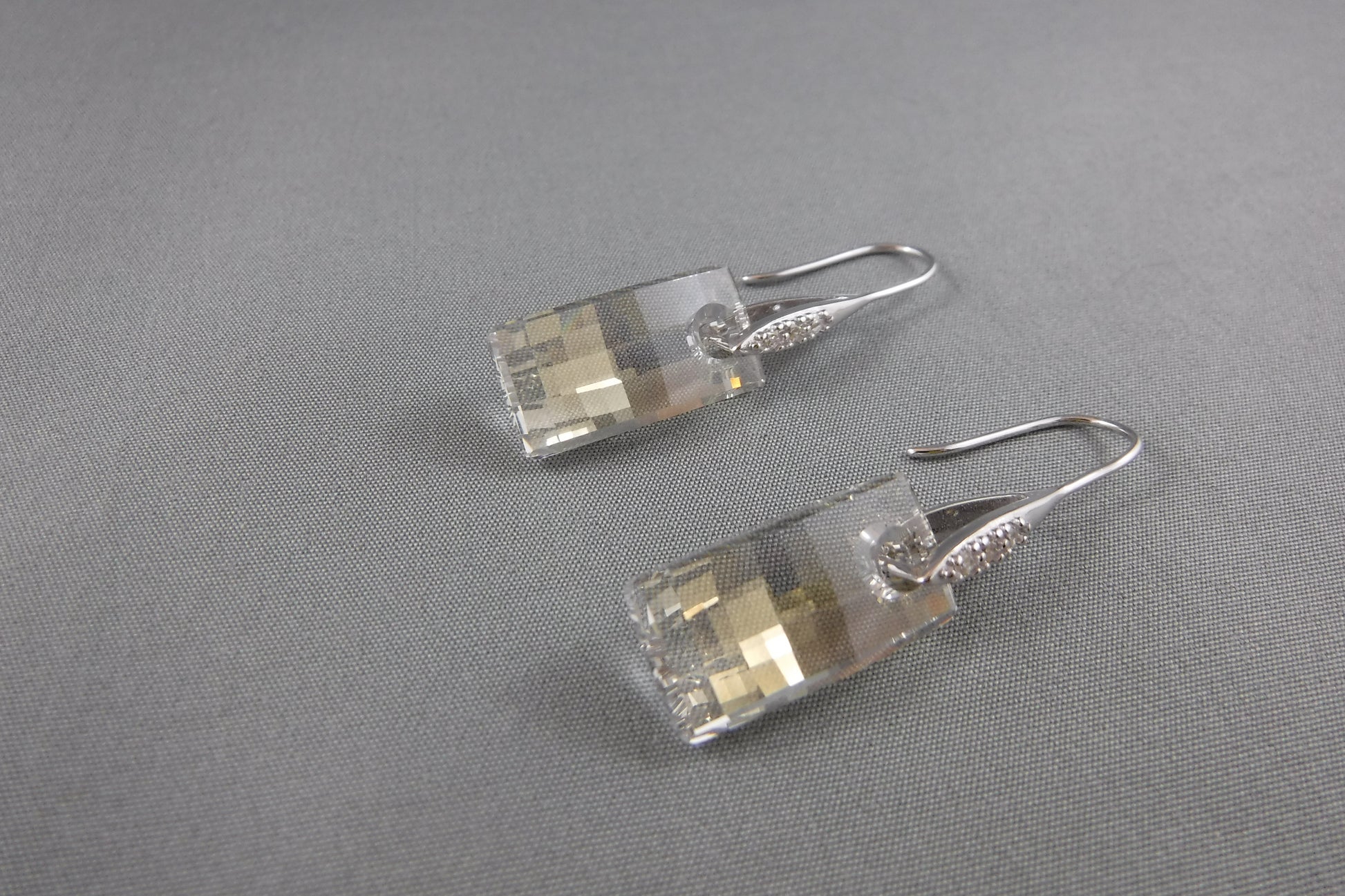 Faceted Swarovski rectangles in "Silver Shade "colour are suspended from Sterling Silver ear wires embellished with Cubic Zirconia. These elegant earring are almost 1 3/4" long and slightly under 1/2" wide.