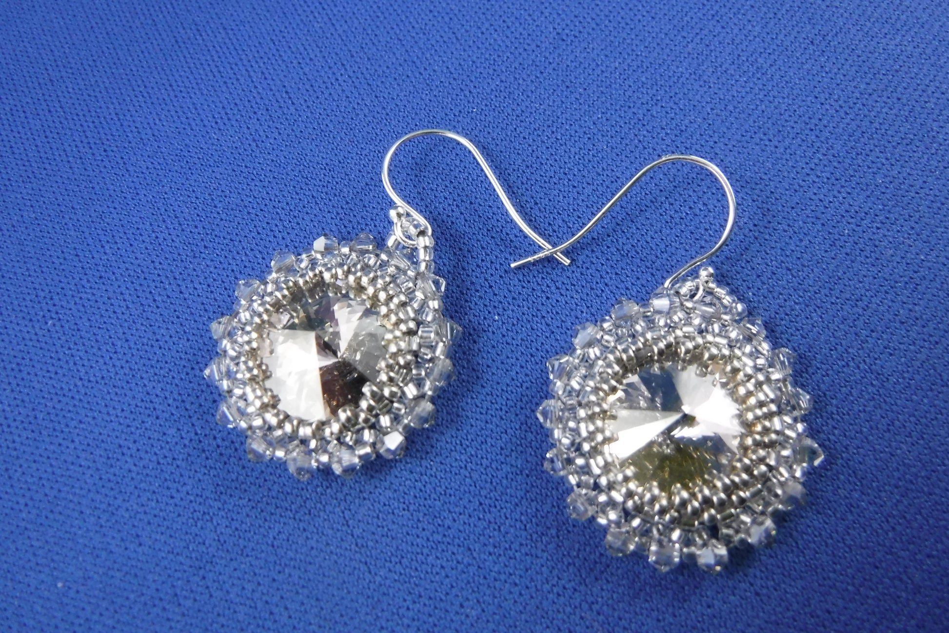 Swarovski crystals beaded with Japanese seed beads and embellished wiith 3mm. Swarovski crystals. The ear wires are Sterling Silver.