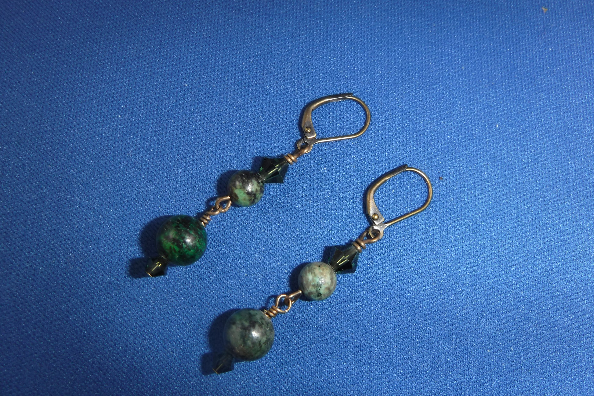 African Tourquoise beads with Swarovski crystals and antique brass ear wires (Nickel-free and French style). These earring match necklace N-509.