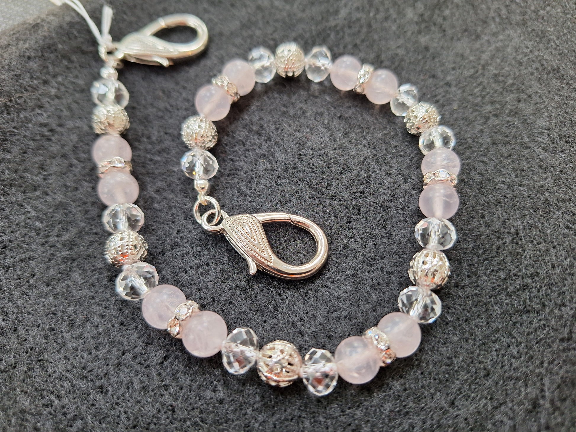 Rose Quartz beads, filigree metal beads, dividers and Chinese Crystals are hand knotted with silk cord to create this attractive and sparkly key finder! It is completed with large metal lobster closures and is 13 1/2" long.