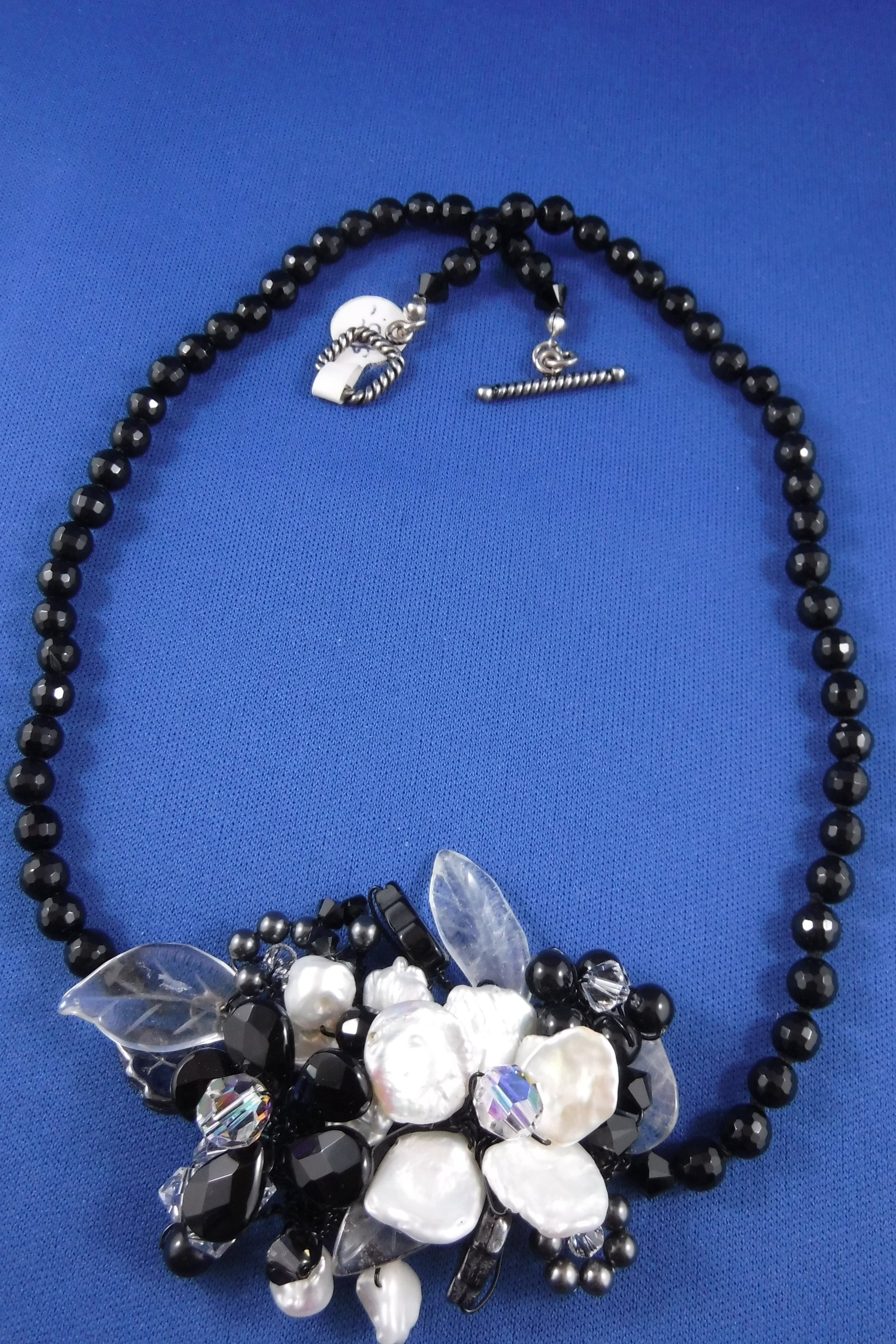Flower cluster necklace with Keshi freshwater pearls, Onyx, Swarovski pearls and crystals and Quartz crystal leaves.Bali Sterling toggle (20 1/2")