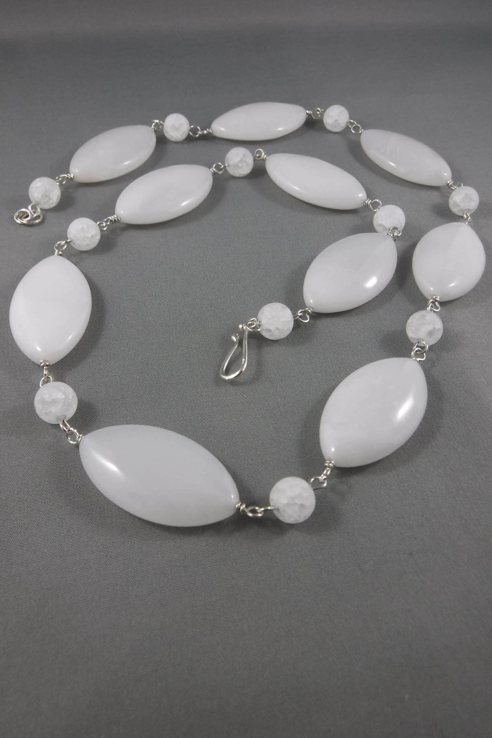 White Jade flat marquise stones connected with Cracked Quartz beads and and Sterling Silver with Sterling Silver hook closure (28 1/2")