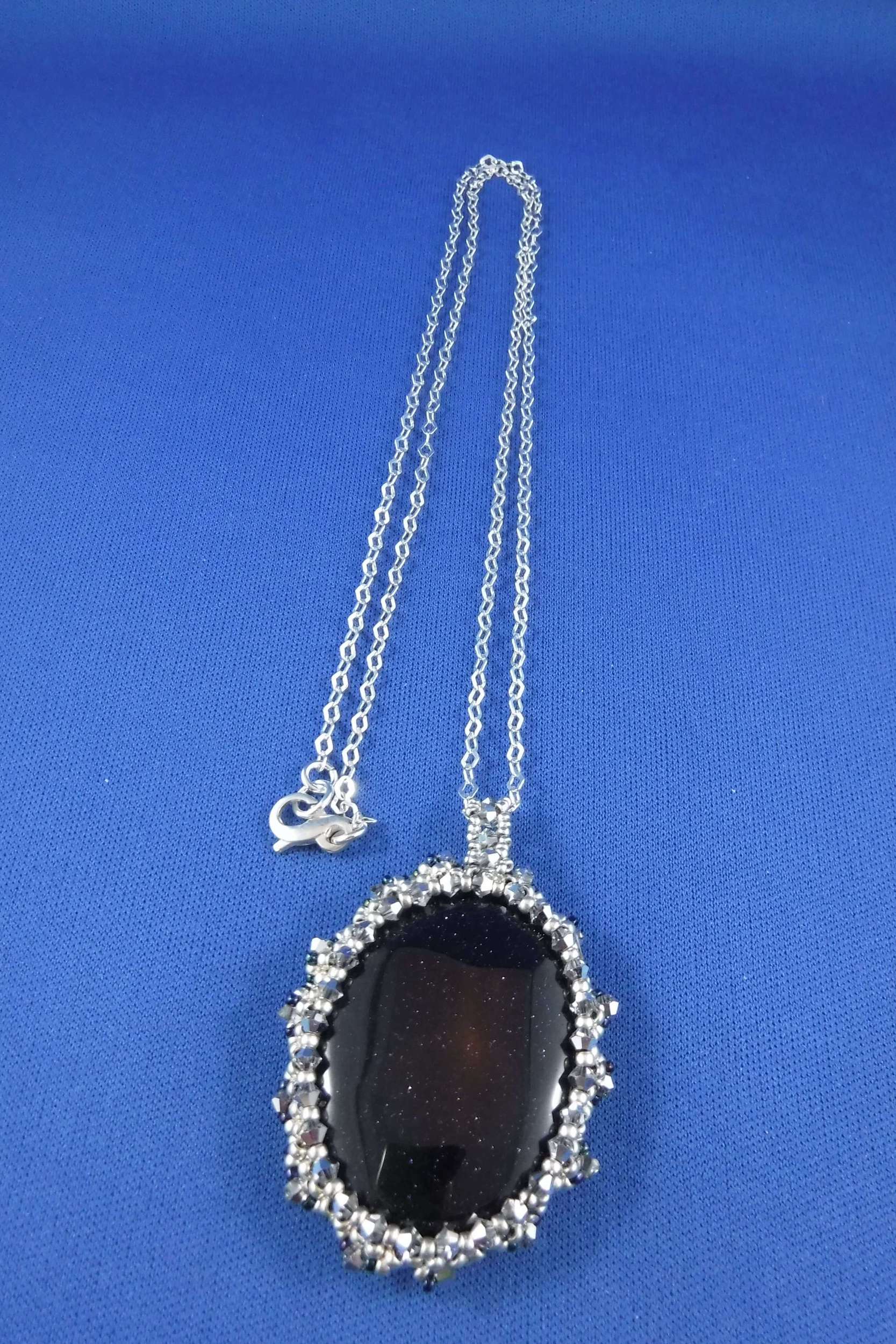 Oval Blue Goldstone bezeled (approx. 1 3/4" by 1 1/2") with Japanese seedbeads and Swarovski crystals, on 24" fine Sterling Silver chain with Sterling Silver lobster closure