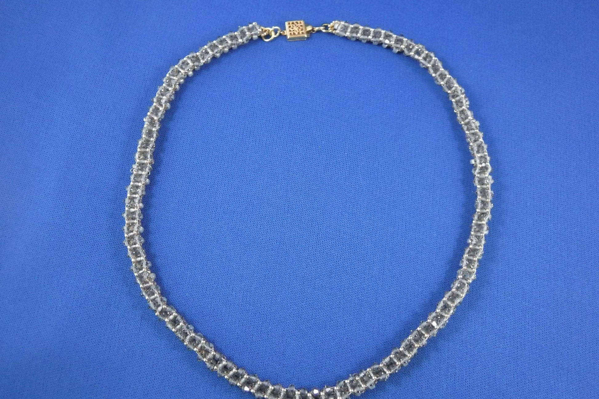 18" beaded necklace made of Swarovski crystals and Japanese seedbeads with a gold-filled box closure (soft grey/gold)