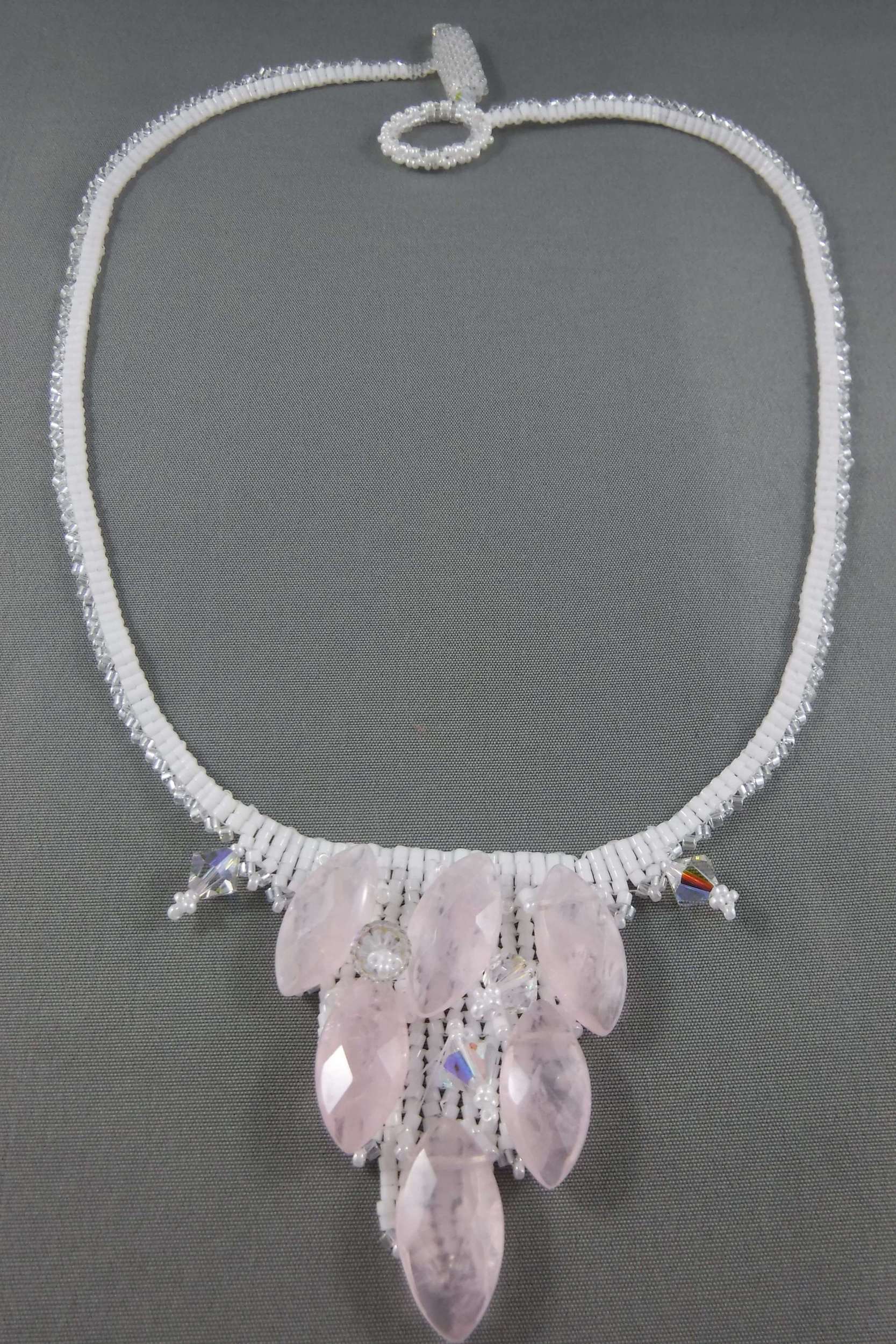 Faceted Rose Quartz marquise-shaped stones with Swarovski crystals on Japanese seedbead base and "chain" with handmade toggle-Metal free (18 1/2")