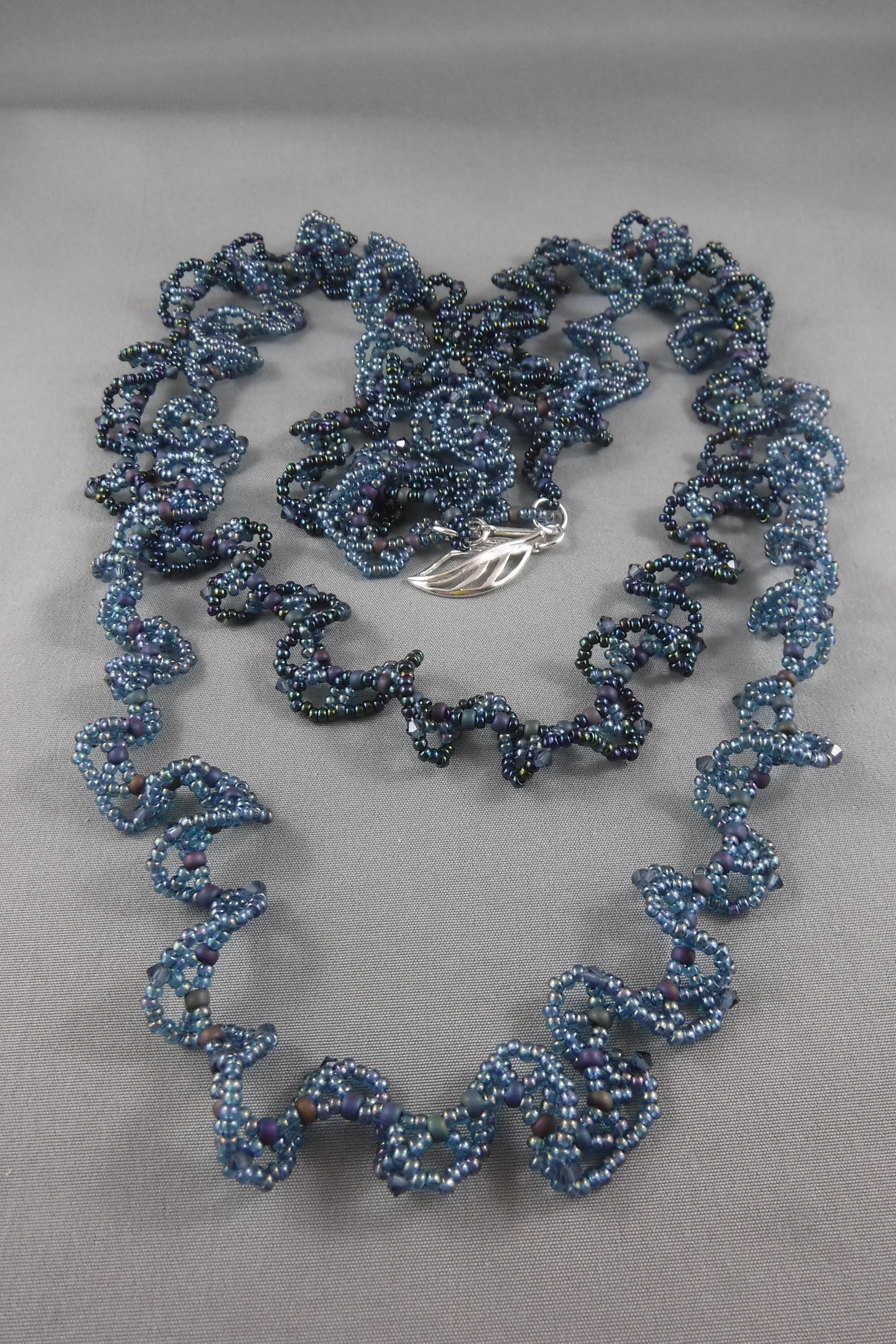 Lacy beaded double strand necklace with "Montana" and deep blue beads and Swarovski crystals, and a Sterling Silver leaf-shaped toggle (26 to 30")