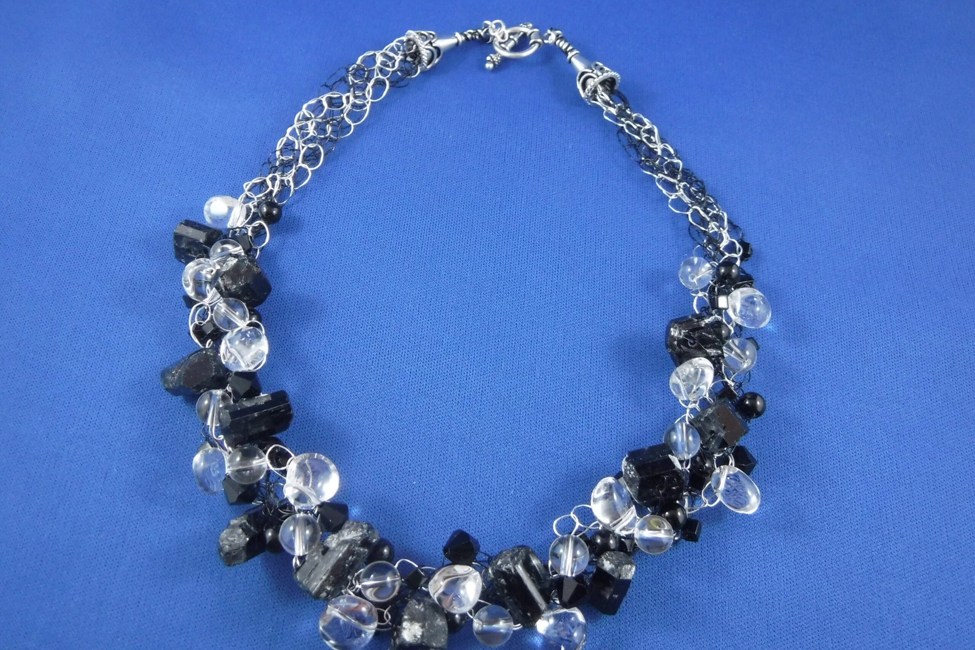 Crocheted, multi-strand necklace with non-tarnish, plated wire, Quartz crystal and Black Tourmaline stones, Swarovski crystals and Sterling Silver Bali end cones and toggle ( 19" long)