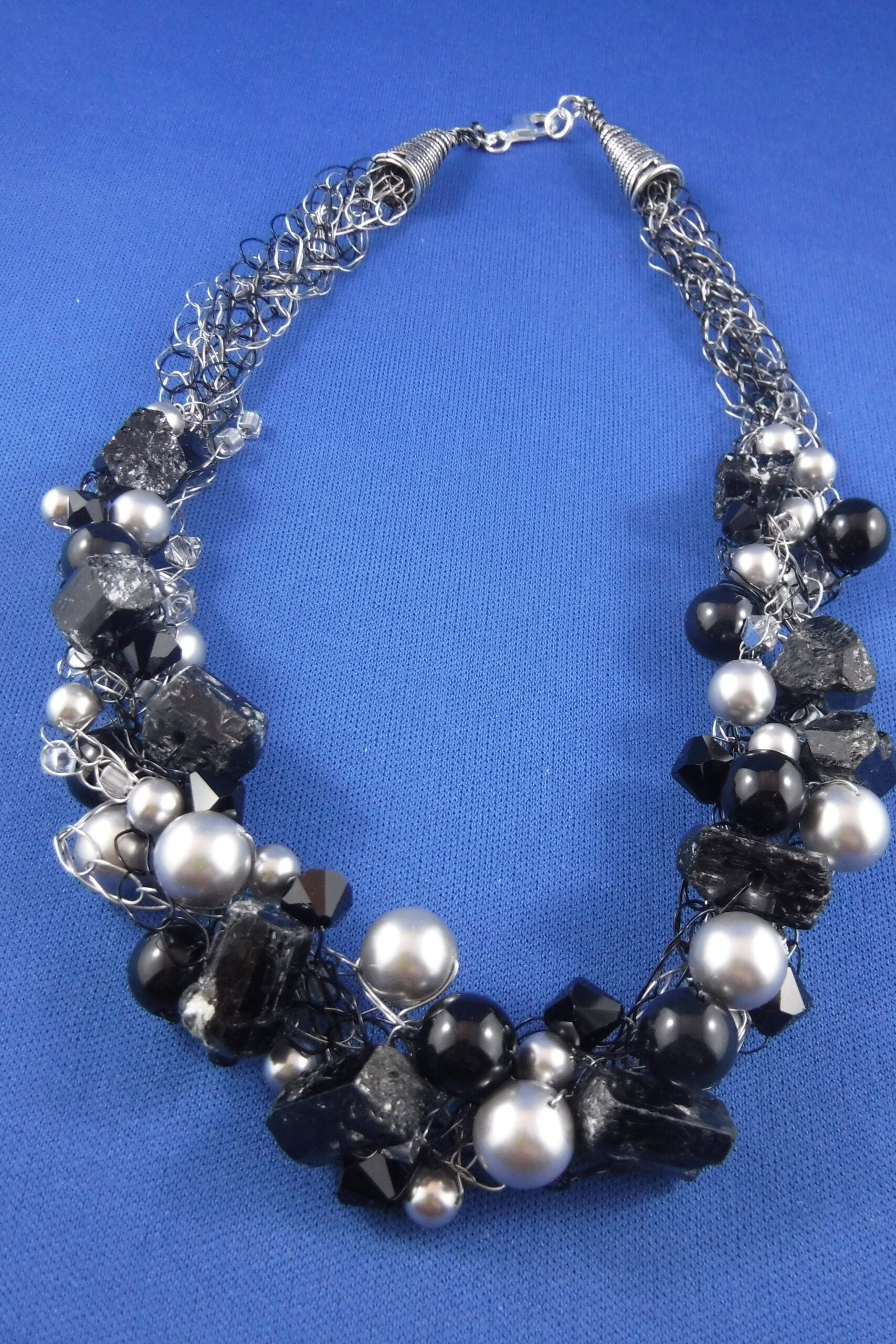 Crocheted, multi-strand necklace with non-tarnish, plated wire, Quartz crystal and Black Tourmaline stones, Swarovski pearls and crystals and Sterling Silver Bali end cones and lobster closure (18 1/4" long)