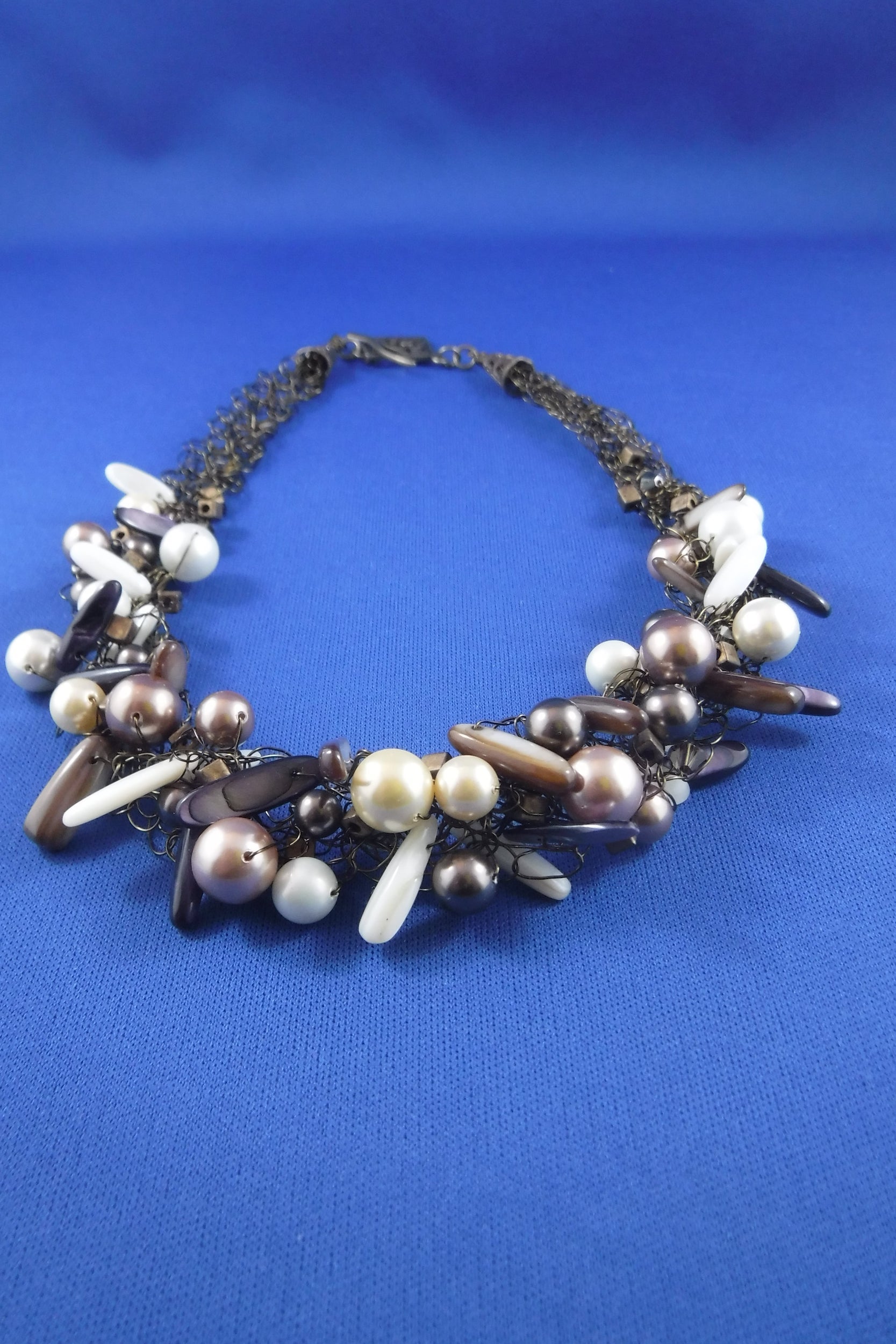 Non-tarnish dark bronze-coloured wire crocheted with shell, shell pearls, and Swarovski crystals; Vintaj bronze end cones and antique brass toggle (18 1/2 ")
