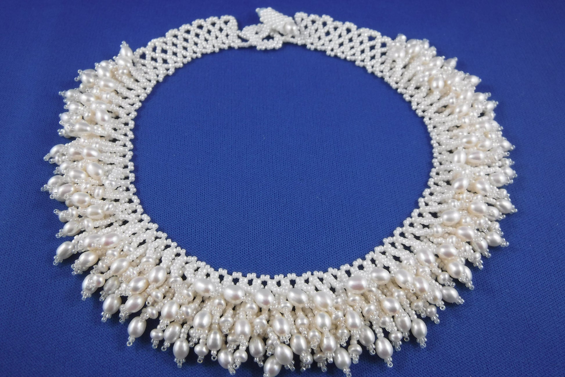 Beaded collar necklace with hundreds of high-quality Freshwater pearls and Japanese seedbeads and beaded, metal-free toggle closure (16 1/4" long and approx. 1 1/2" wide).