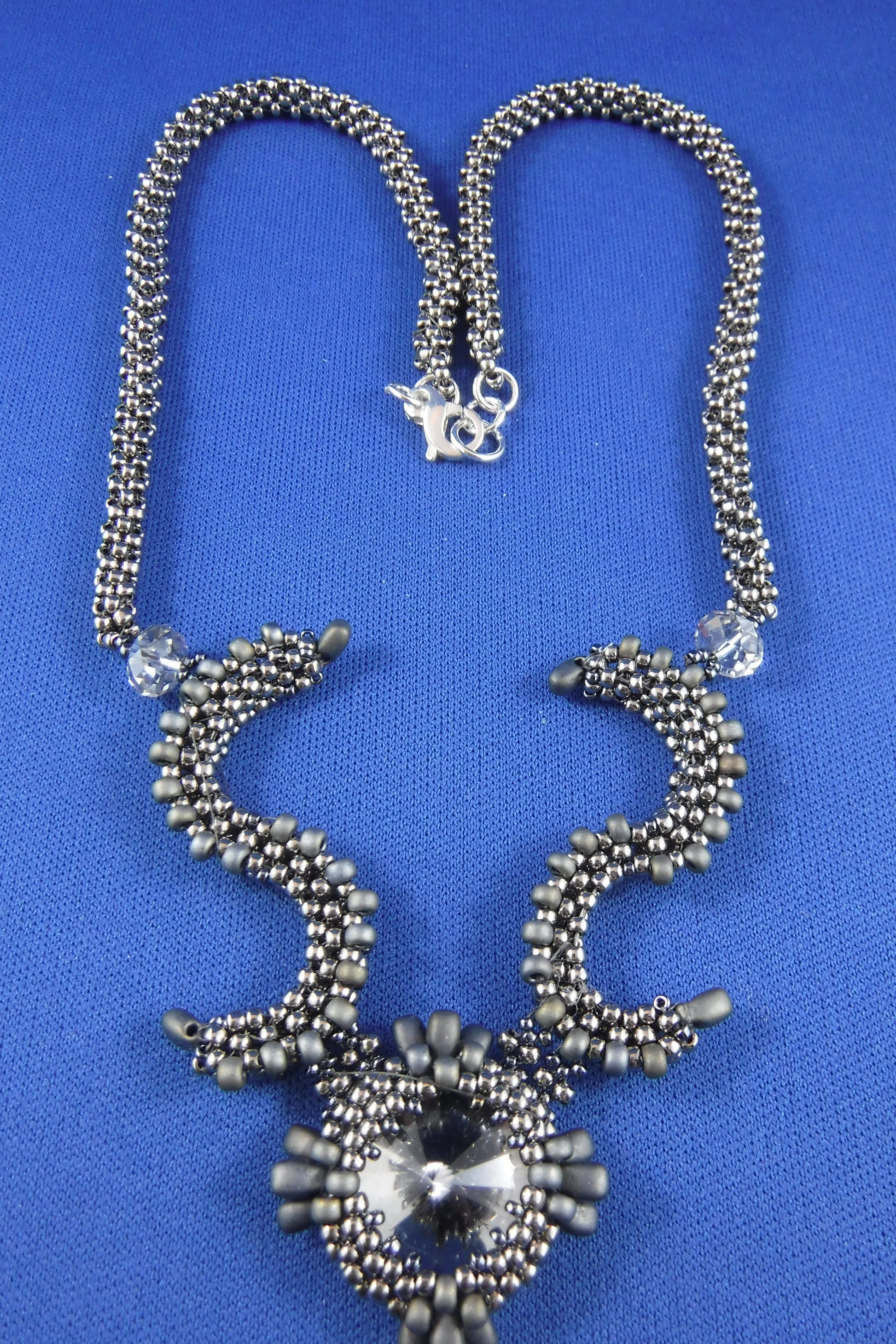 Beaded, antique-looking and elegant necklace with a dark grey Swarovski crystal focal point and fancy Sterlling Silver lobster closure (20" long).See matching earrings: E-547 (studs) or E-614