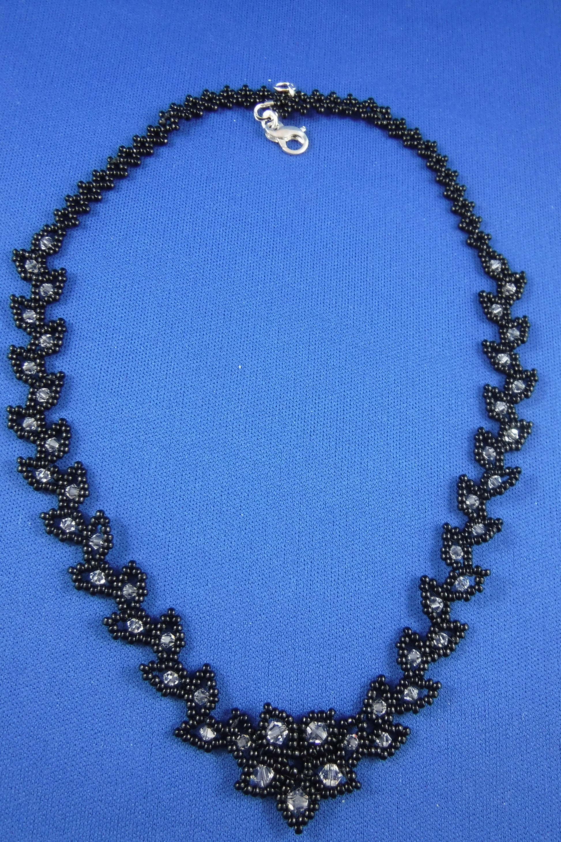 Delicate beaded necklace: Small petal shapes with Swarovski crystal centres and Figure-8, Sterling Silver lobster closure (18" long).